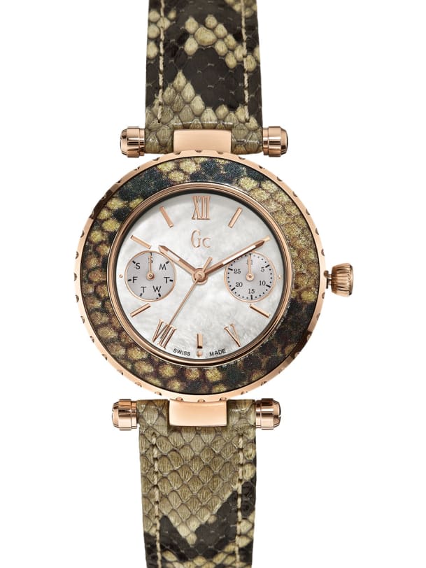 Seit rund 16 Jahren gibt’s die Marke Gc . Sie ist verwandt mit Guess, legt aber Wert auf Eigenständigkeit, denn Paul Marciano, Gründer des weltbekannten Fashionlabels hat mit Gc eine persönliche, kleine und feine Kollektion kreiert. An der Baselworld aufgegefallen ist die Roségoldene mit Pythonprint.