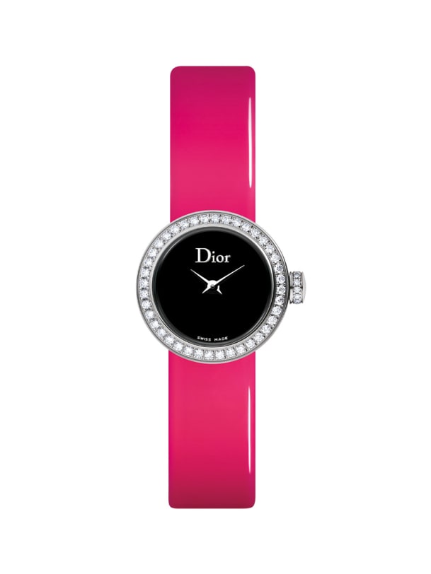 Ach, ist die süss und 19 Millimeter niedlich: La Mini D ist mit dem fluoreszendierendem Hotpink-Armband, dem rabenschwarzen Zifferblatt und den Glitzerdiamanten auf dem Stahlgehäuse auch ziemlich cool.