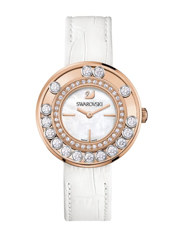 Mehr Glitzer ist kaum möglich: Unübersehbar auf rund zweitausend Quadrametern Ausstellungsfläche präsentiert Swarovski die Glanzstücke aus ihren Uhren- und Schmuckkollektionen. Besonders funkelnd ist die Lovely Crystals mit dem goldenen PVD-Finish und den 16 beweglichen Zirkoniasteinen.