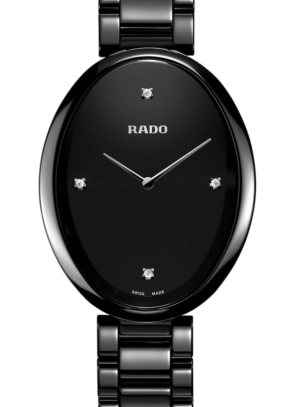 Mit Fingerspitzengefühl die Zeit richten: Die Zeiger der Rado Esenza reagieren auf Drücken und Streicheln des Saphirglases, links für die Stunden, rechts für die Minuten. Die Touch-Technologien im Hightech-Keramikgehäuse machen die Krone überflüssig, und die Batterien für das Quarzwerk halten vier Jahre.