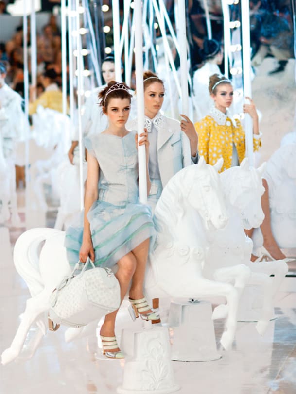 Das grosse Defilee von Louis Vuitton ist einer der letzten Höhepunkte der Pariser Fashion Week. Marc Jacobs will um 10 Uhr in der Früh seine Kollektion für Louis Vuitton in einem Zelt nahe des Louvre zeigen. Überpünktlich, drei Minuten vor zehn, hebt sich der Vorhang, und ein grosses weisses Karussell beginnt sich zu drehen. Auf den ebenfalls weissen Pferden sitzen die Models, die später von ihren Rössern steigen und im Kreis defilieren. Als letzte folgt Kate Moss, die schon bei der letzten Louis-Vuitton-Show einen grossen Auftritt hatte. Irgendwie scheint ihr das hier aber alles etwas zu früh am Morgen zu sein: Sie dreht ihre Runden mit übertriebener Attitude. Um 10.08 Uhr ist das Spektakel vorbei. Elf Minuten! Marc, das ist ein Rekord.