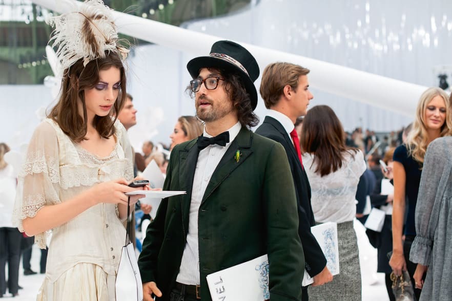 Die Show der Superlative: Chanel fährt an der grössten Location mit dem grössten Setting, einer Unterwasserlandschaft ganz in Weiss, auf, und 85 Models führen 85 Looks vor. Das eigentliche Spektakel beginnt aber vor der Show mit dem Einlass der Einkäufer, der Presse und der Stars, die en masse ins Grand Palais strömen. Während sich die Sitzstufen langsam füllen, entdeckt man bekannte Gesichter. Den ganz in Leder gekleideten Architekten Peter Marino, eine auffällig jugendlich wirkende Uma Thurman, den Starfotografen Mario Testino und Sean Lennon mit Freundin Charlotte Kemp Muhl.