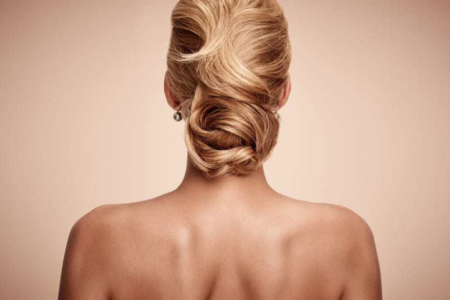 Step 5: Nun das Haar am Oberkopf lösen, in einer Welle nach hinten frisieren und die Längen um den Chignon legen. Die Haarspitzen unter dem Chignon verstecken und feststecken.