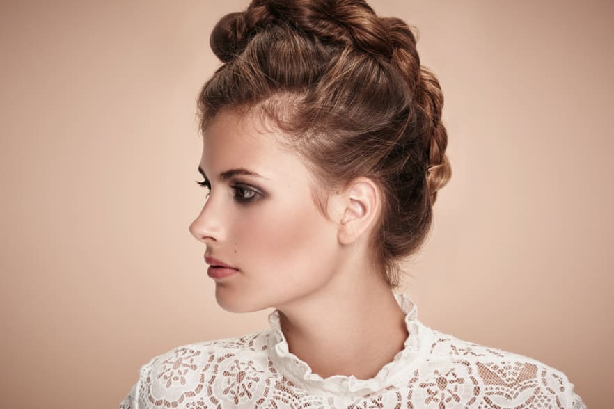 Step 5: Nun das Haar am Oberkopf lösen, in einer Welle nach hinten frisieren und die Längen um den Chignon legen. Die Haarspitzen unter dem Chignon verstecken und feststecken.