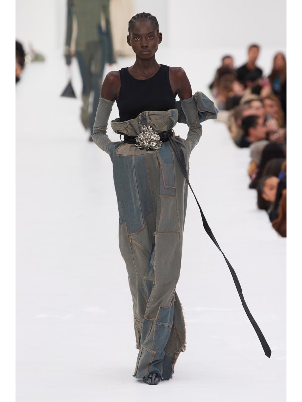 Denim machte das schwedische Label Acne Studios Ende der Neunzigerjahre bekannt. Diese Saison zollte Designer Jonny Johansson dem Material Tribut und zeigte es in erfrischend pompösen Silhouetten. Mein Highlight: der Patchwork-Maxirock aus Jeansfetzen mit passenden Handschuhen.