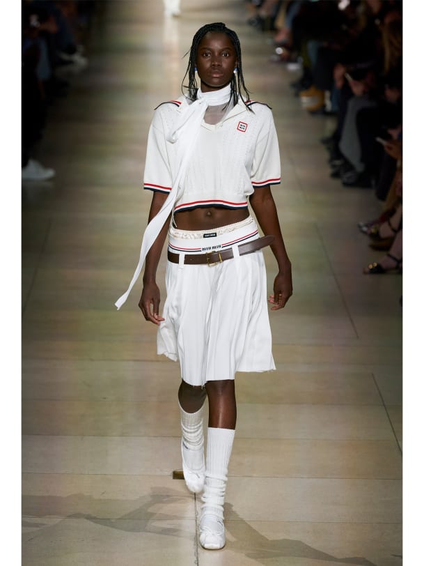 Miu Miu war die letzte Show am letzten Tag der Pariser Fashion Week und schon der erste Look – ein Tennis-Chic-Zweiteiler – machte klar: Das Beste kommt tatsächlich zum Schluss. Miuccia Prada knüpfte nahtlos an den Mega-Erfolg ihrer Frühling/Sommer-Kollektion an. Das Resultat: Die Miniröcke, Low-Waist-Schnitte, und Schuluniformen bleiben, doch das Miu Miu Girl wird sportlicher und auch etwas edgier mit viel Leder, Strass und Nieten.