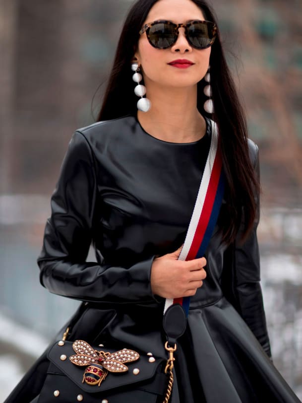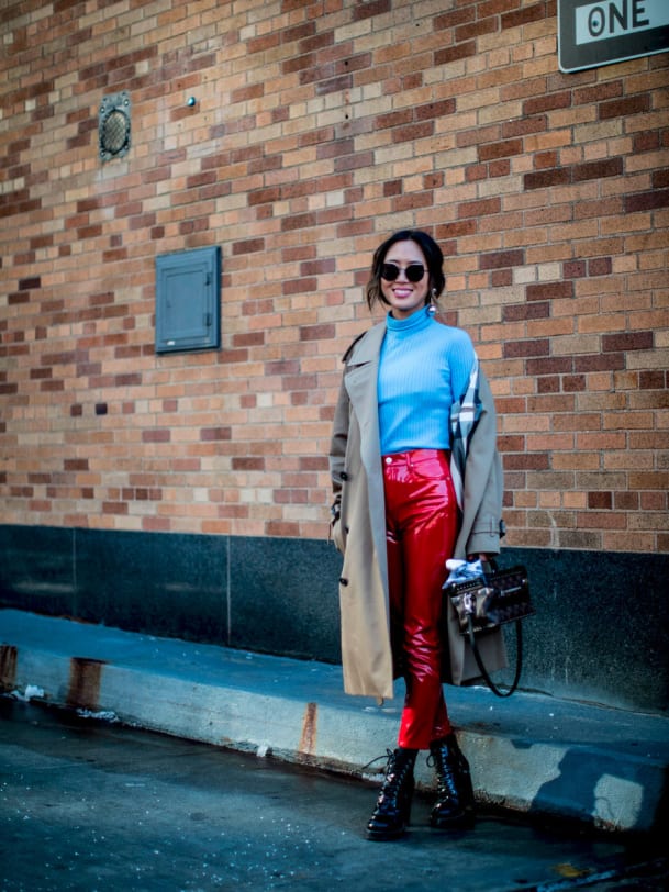 Modebloggerin Amie Song in auffälliger Lackhose und Trenchcoat