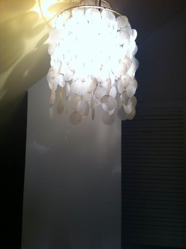 "Wenn der Windhauch mit den vielen zarten Perlmuttplättchen meiner Muschelleuchte von Verner Panton für Verpan spielt, verzaubern diese das Licht in meinem Schlafzimmer"