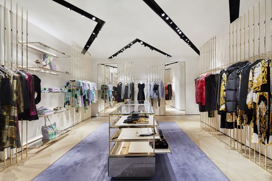 Bei der Konzeption des neuen Versace-Stores stand die Nachhaltigkeit im Vordergrund – von der Auswahl der Materialien bis zur Nutzung des Raums. Weisser Marmor und blaue und goldene Teppiche laden zum Verweilen ein.
