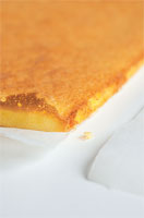 Butter und Milch beifügen, rasch mischen. Masse sofort auf das vorbereitete Blech gleichmässig verteilen. Glatt streichen. Blech mehrmals auf die Arbeitsfläche klopfen, damit Luftblasen aufsteigen.