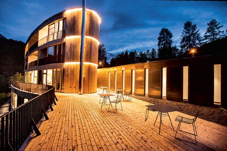 Mein erster Gedanke: Ein aussergewöhnlicher ellipsenförmiger Neubau aus Arvenholz, Glas und Metall, der trotz der reduzierten Architektur viel Gemütlichkeit ausstrahlt, sich harmonisch in die Landschaft eingliedert und herrlich nach Holz duftet.