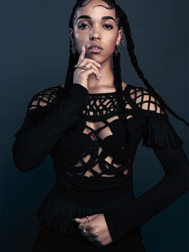 In den Neunzigern in Gloucestershire aufgewachsen, bezieht FKA Twigs – FKA steht für "formerly known as" – viele ihrer Outfit-Inspirationen aus dieser Zeit, wie Hörnchenfrisur, Piercings, Raver-Schlaghosen und Transparenz. Dazu mischt sie Streetwear und Reminiszenzen an ihren jamaicanisch-spanischen Background, beispielsweise goldene Statement-Ohrringe und Latina-Gelnägel.