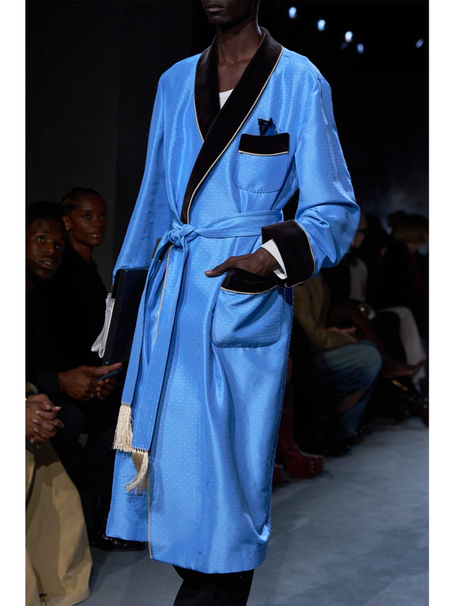 Die Designer:innen scheinen viel Inspiration in ihren eigenen vier Wänden gefunden zu haben. Quasten, wie wir sie von schweren Samtvorhängen kennen, hingen an Jacken (Dries Van Noten), Lampenschirme wurden zu Hüten (Zomer) und Sofaplaids zu Zweiteilern (Burberry). Die üppigen Prints der präsentierten Kleidung erinnerten an in die Jahre gekommene Tapeten und Teppiche.