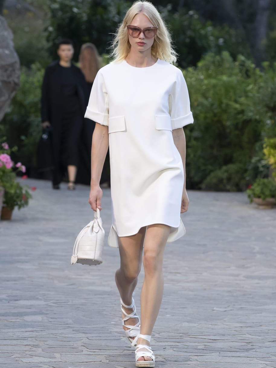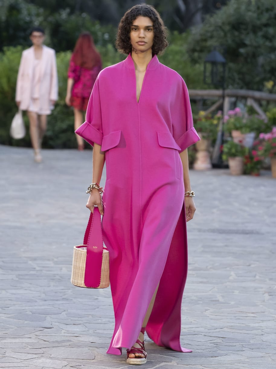Bodenlage Kaftan-Kleider mit hohen Schlitzen, kurze A-linienförmige Mäntel, doppelreihige Trenchcoats mit Cape-Ärmel, Mid-Century-Silhouetten, leger getragen, aber von architektonischer Klarheit, in Beige, Weiss, Schwarz und Pink. Das wirkt nicht nur wahnsinnig elegant, sondern versprüht auch den Anschein von Komfort und Gelassenheit, mit der sich auch Abfertigungshallen während der Ferienzeit ertragen lassen.