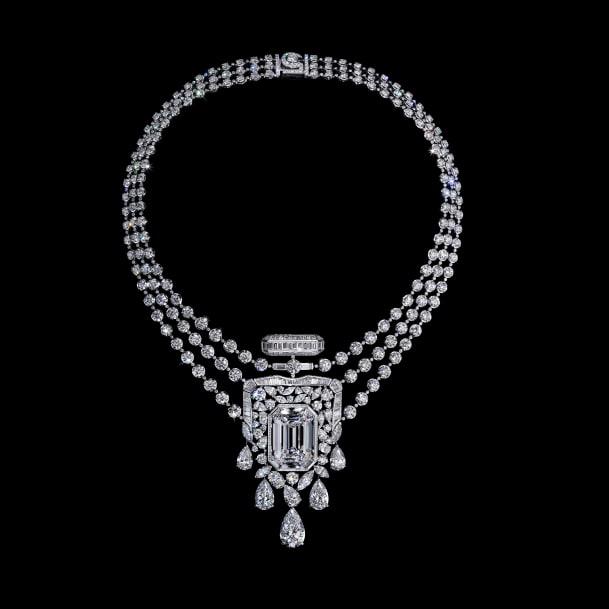 Die einen sagen es mit Blumen, die anderen mit Diamanten: Zum 100. Geburtstag des Parfum-Klassikers N°5 hat Chanel eine Haute-Joaillerie-Kollektion entworfen, die dem Duft und seinem ikonischen Flacon gewidmet ist. Das Herzstück der Kollektion bildet das Collier 55.55 mit einem perfekt achteckig geschliffenen, 55.55-Karat schweren Diamanten, in Reinheit und Farbe von höchster Güte. Eine Halskette, die man für Geld nicht kaufen kann.