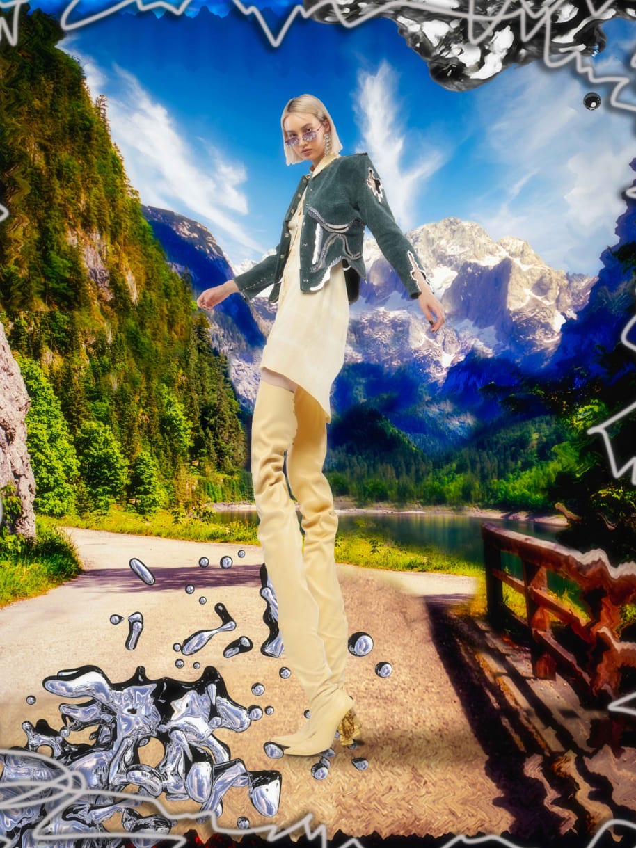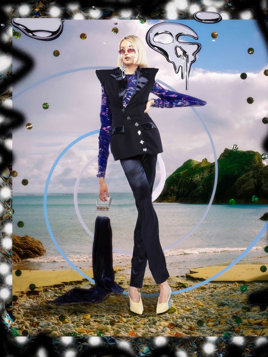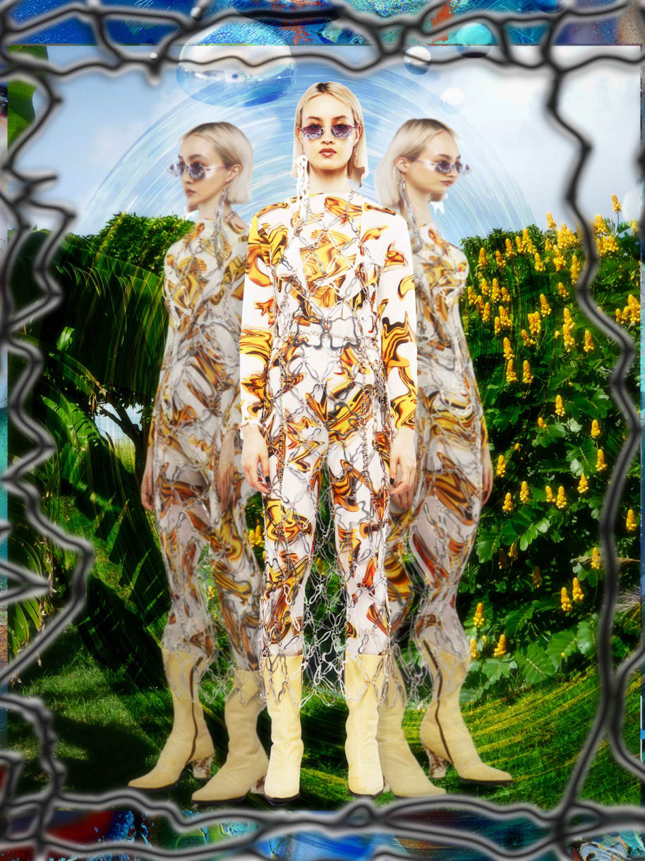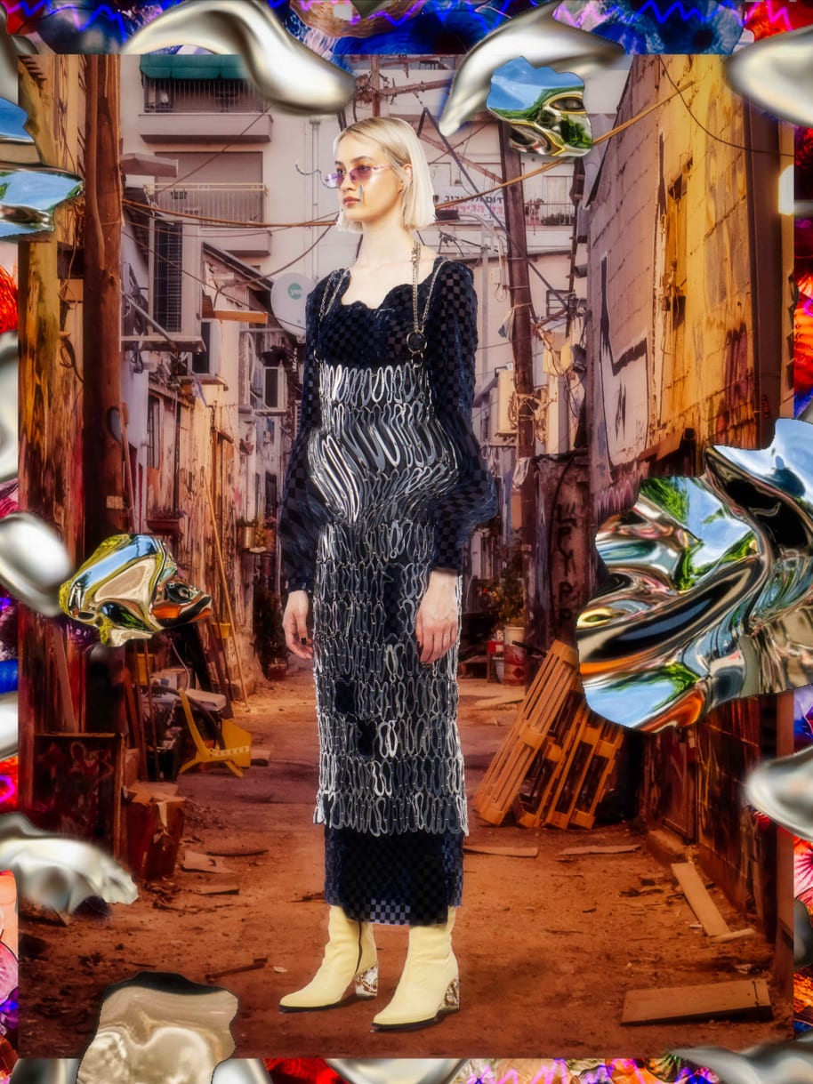 Alle beherbergen eine "Digital Queen". Meine "Digital Queen" ist ein Schlüsselelement dieser Kollektion und zugleich ein Echo der Digitalisierung. Ich will sensibilisieren: Ich verbinde Metall und Materie. Damit thematisiere und uminterpretiere ich unsere ständige Hyperkonnektivität durch neue Technologien und die Verschmelzung zwischen Mensch und Maschine zum Cyborg. Meine Designs sind hybride Kleider aus dekonstruierten Mustern und Silhouetten. Zentral im Designprozess meiner Kleidungsstücke ist ihre Entstehung. Ein Gemisch aus Computerprozessen und anschliessender Handarbeit erlaubt es mir, Kleidungsstücken neuen und absurden Ausdruck zu verleihen.