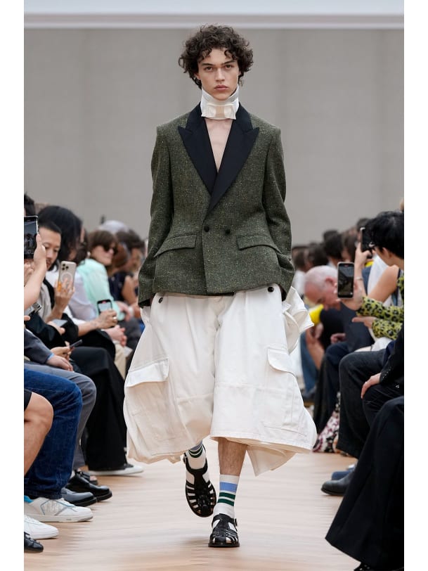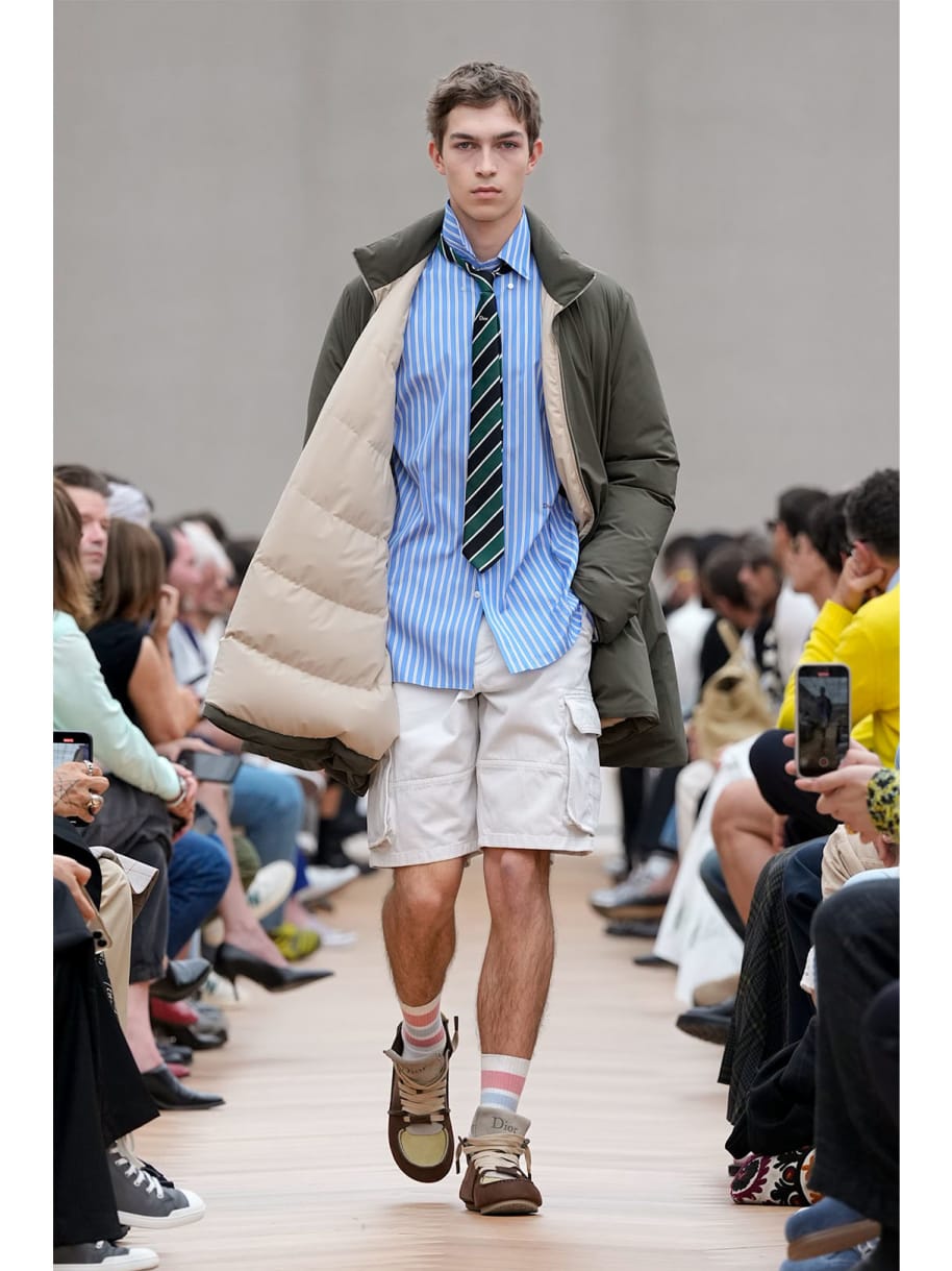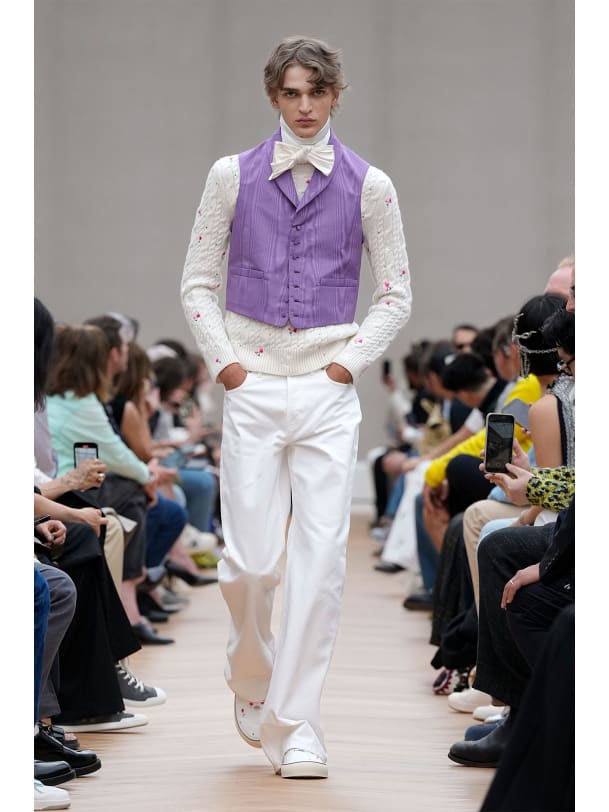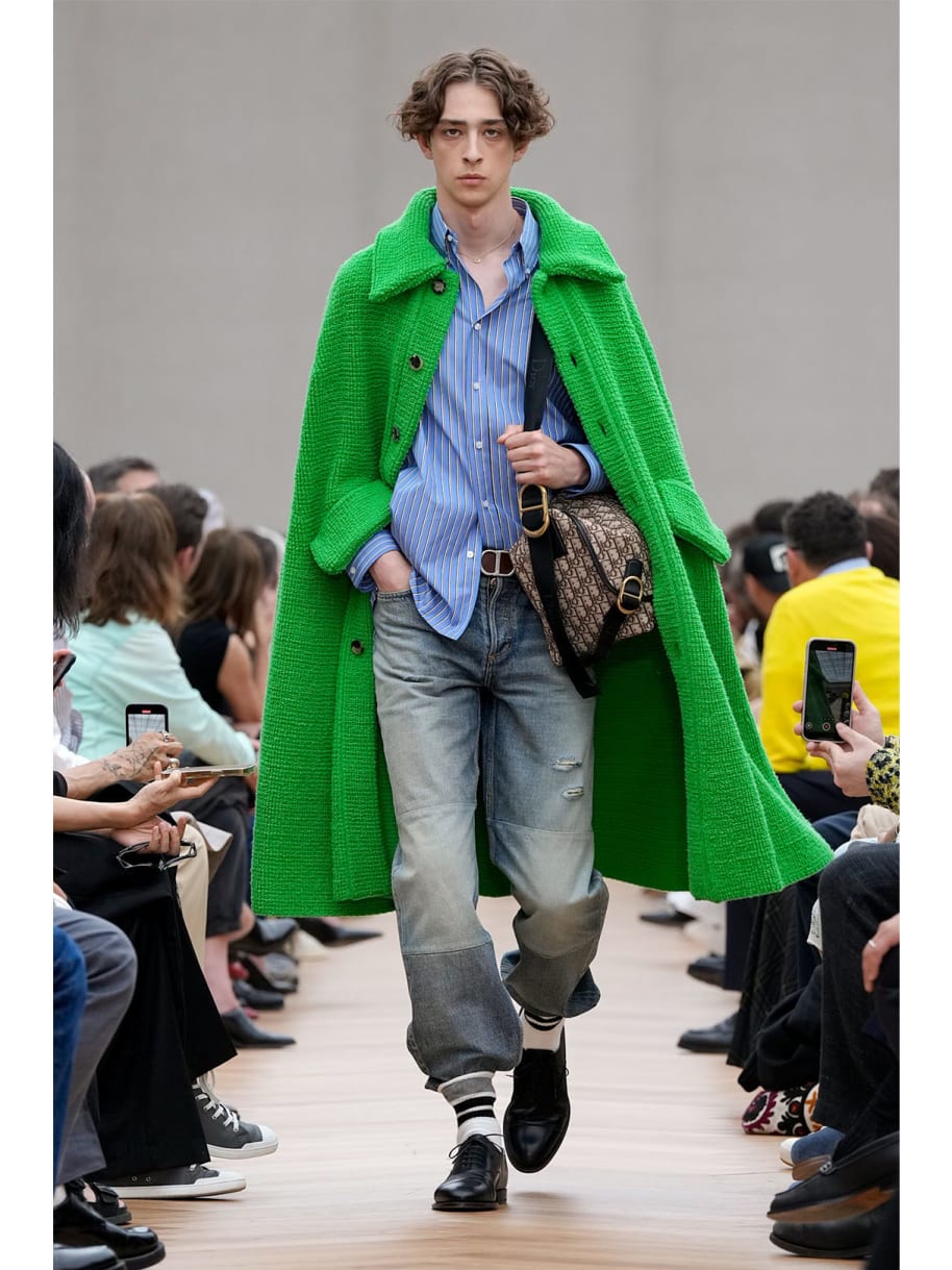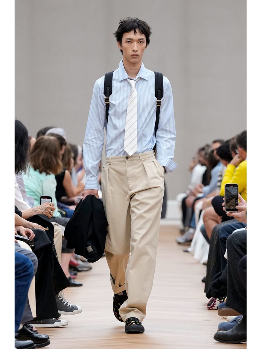 Offene Schnürsenkel, Krawatten, die verkehrt herum baumeln, Hemdkrägen, die einseitig stehen, Schals, die irgendwo raushängen, und Hosenbeine, die wild hochgekrempelt wurden. Dazu viel Denim und eine ordentliche Portion Lässigkeit. Und als wäre das nicht schon genug: Bei einigen Looks lässt Anderson die Hose einfach ganz weg – das Model läuft in Unterhose, Pulli und Jeansjacke über den Laufsteg. Ganz klar, hier wird Nonchalance zelebriert.