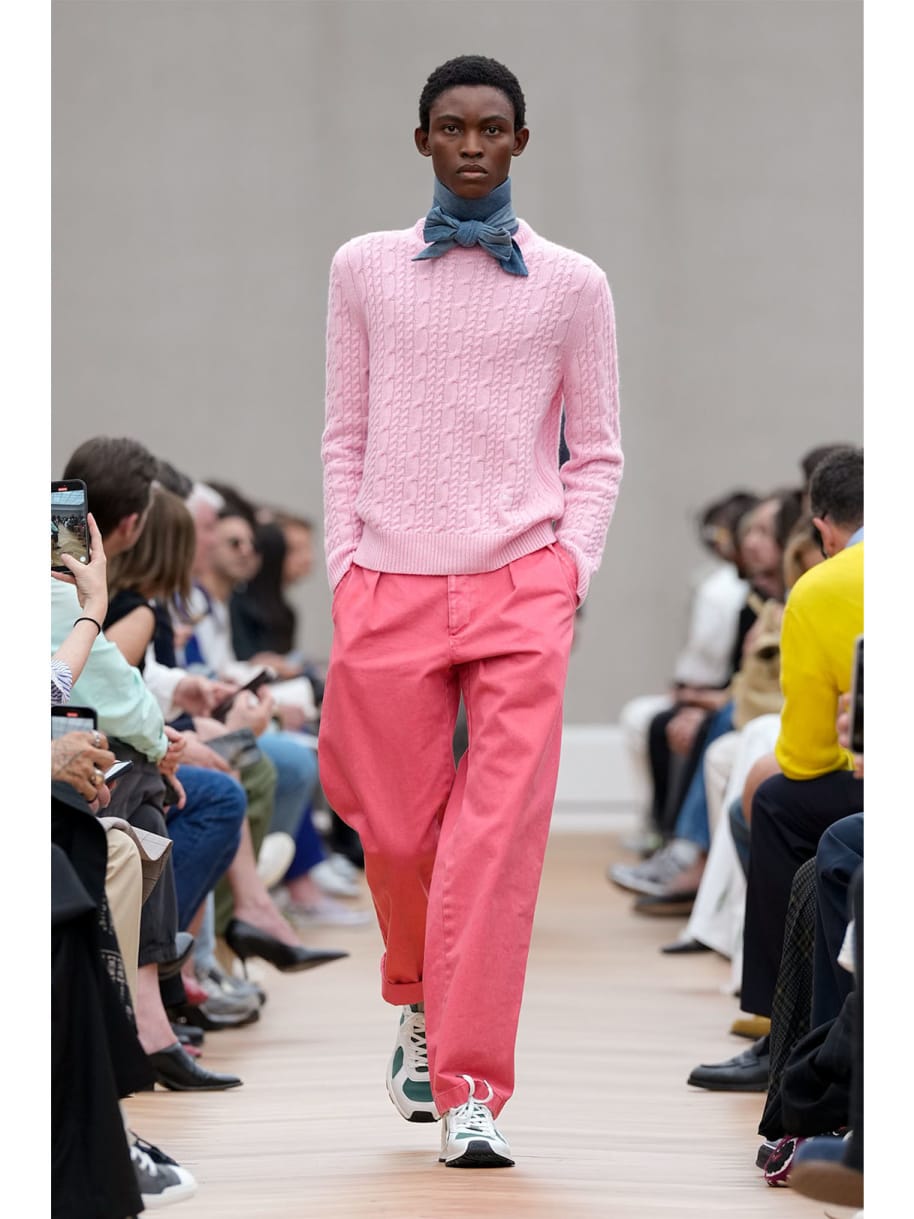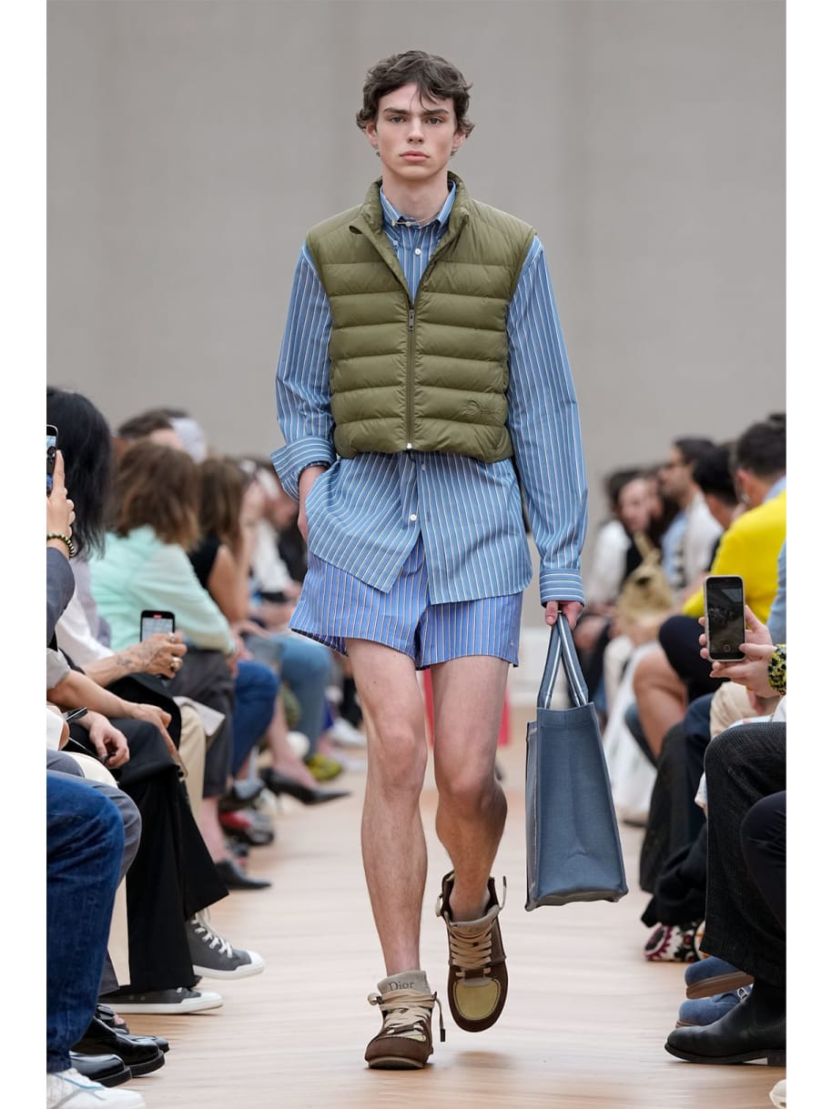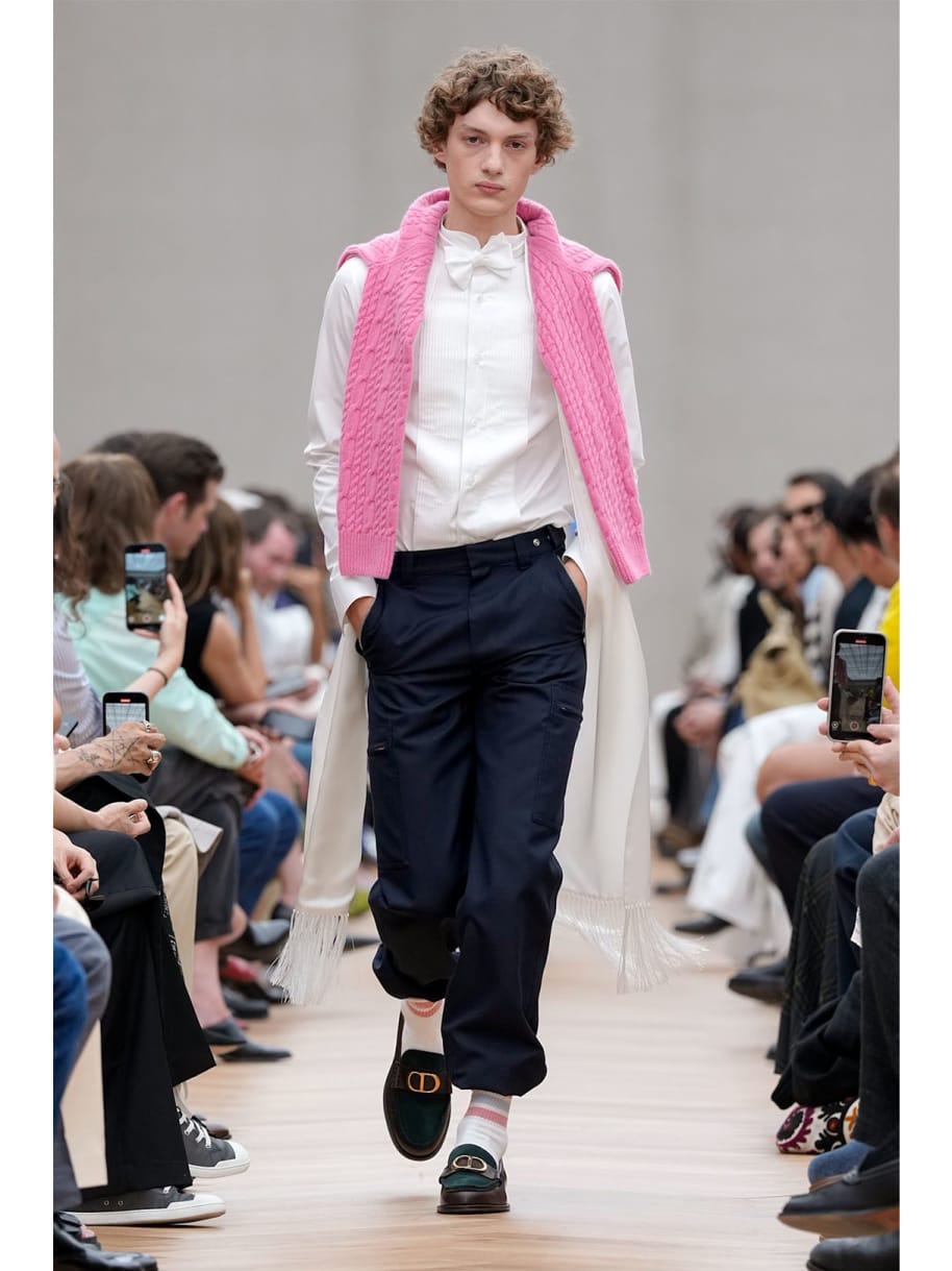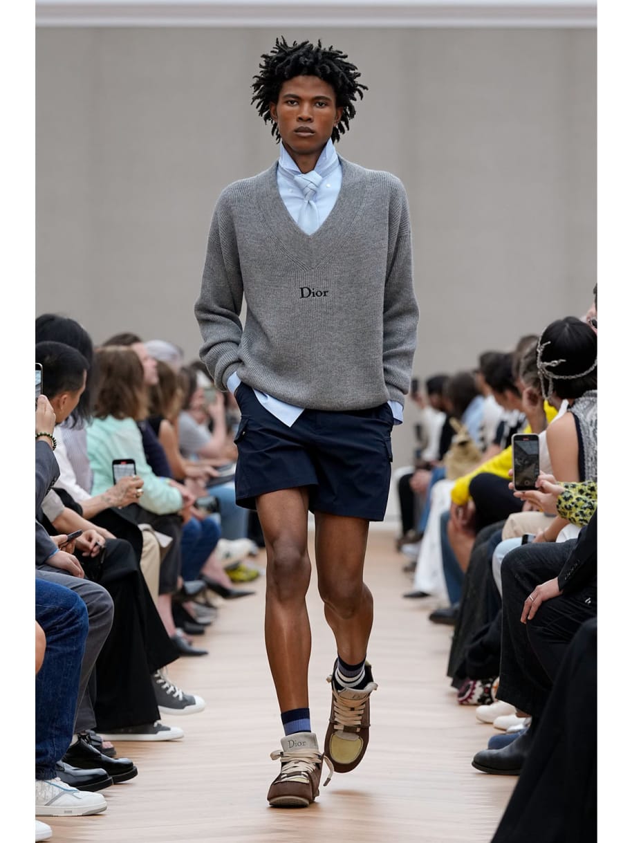 Andersons Dior-Boy trägt Zopfmuster, hochgezogene Socken und Hemden mit locker geschnürter Krawatte. Klassische Preppy-Codes, die zu Andersons Handschrift gehören, überträgt er mit feinem Gespür auf den Dior-Look. Es gelingt ihm, die uniformellen College-Anlehnungen mit der romantischen Eleganz des Hauses zu verschmelzen und einen neuen, unverkennbaren Look zu erschaffen, der Lust auf einen Hauch Spiessigkeit macht.