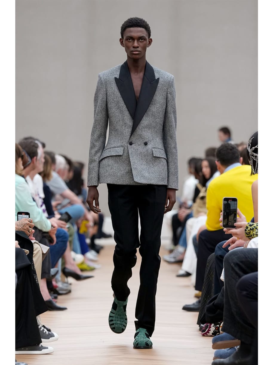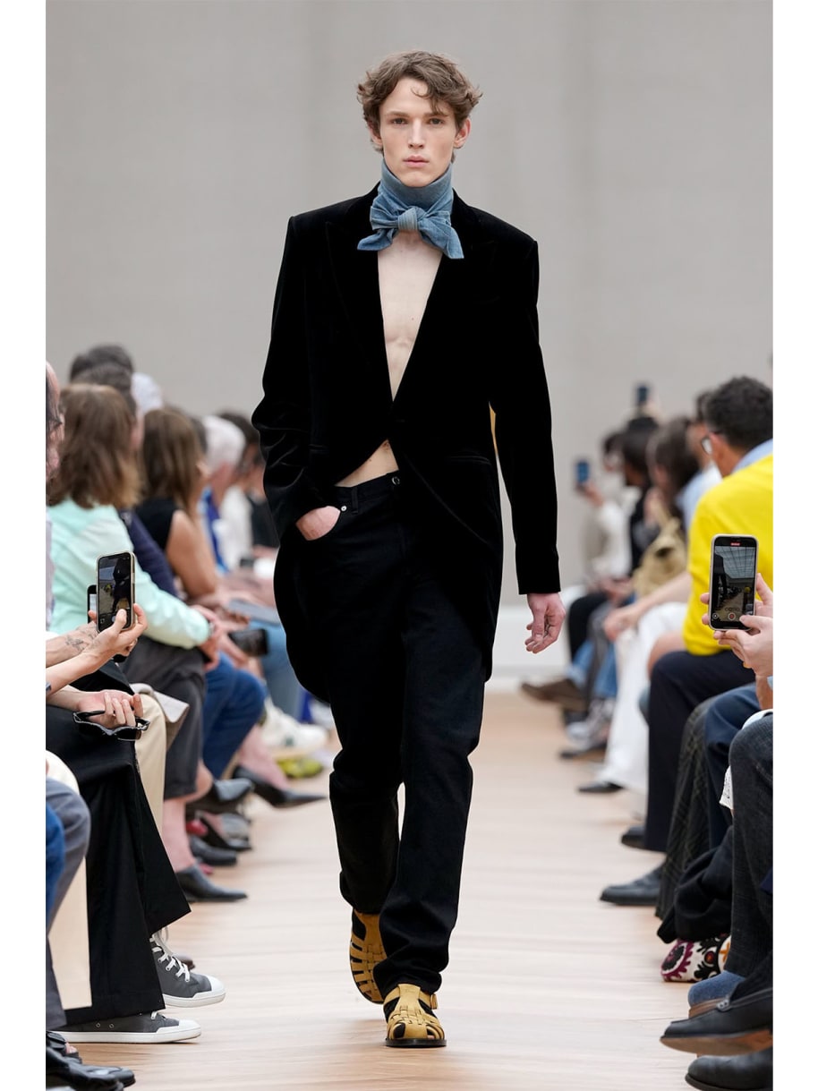 Wie schon bei Loewe nimmt sich Anderson auch bei Dior der Smoking-Etikette an (man erinnere sich an die Fracks der Herbst-/Winterkollektion 2024, die er für das spanische Modehaus entwarf): mit subtilen Dekonstruktionen (verkürzte Jacken), ungewöhnlichen Stoffen (Samt) und verspieltem Styling (schräge Fliegen-Neck-Ties). Ein Dior-Smoking, der Regeln bricht.