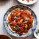 Topf bei mittlerer bis starker Hitze auf dem Herd lassen. Fleisch, Knoblauch und Ingwer einrühren. Unter gelegentlichem Rühren 5 bis 7 Minuten braten, bis das Fleisch leicht gebräunt ist. Reiswein angiessen und 1 Minute verkochen lassen. Toban Djan, Sojasauce und 250 Milliliter Wasser einrühren. Alles mit schräg aufgelegtem Deckel bei mittlerer bis schwacher Hitze etwa 25 Minuten köcheln lassen. Dabei gelegentlich umrühren.