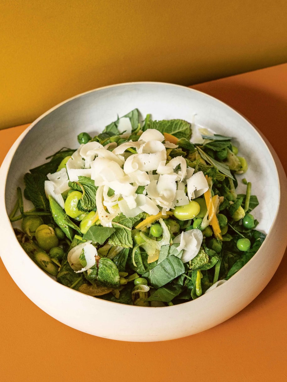 Erbsen, Bohnen, Spargeln und Spinat mit Dressing und eingelegter Zitrone vermengen. Auf Tellern anrichten und mit gehobeltem Pecorino, Minze, Basilikum und Frühlingszwiebelweiss garnieren.