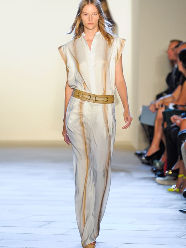 Back to the Roots und beständigem Erfolg heisst es bei Belstaff, der ursprünglich englischen Marke, die eigentlich für gewachste klassische Outdoorwear und Lederjacken bekannt ist. Getragen haben diese immerhin Che Guevara, Amelia Earhart und Steve McQueen. 2011 wurde Belstaff von der Labelux Gruppe, vom amerikanischen Geschäftsmann Harry Slatkin und Tommy Hilfiger übernommen und bekam mit Martin Cooper einen neuen Creative Director. Das Thema der Frühlingskollektion 2013 ist simpel: Streifen in allen Grössen und in Naturtönen von Gelb, über Khaki bis Pastellorange über Hemdkleider, weite Hosen, kurze Röcke und Jacken im Bikerstil gezogen. Nichts aufregendes, aber eindringlich, weil konsequent. Sofort entsteht ein deutliches Bild, stellt man sich die Kollektion nach der Präsentation vor dem inneren Auge nochmals vor. Und eine klare Handschrift braucht die Marke, bevor sie vielleicht etwas mutigere aufregendere Kollektionen präsentieren kann. Im Herbst werden erst Mal Flagshipstores an bester Lage in New York und London eröffnet.