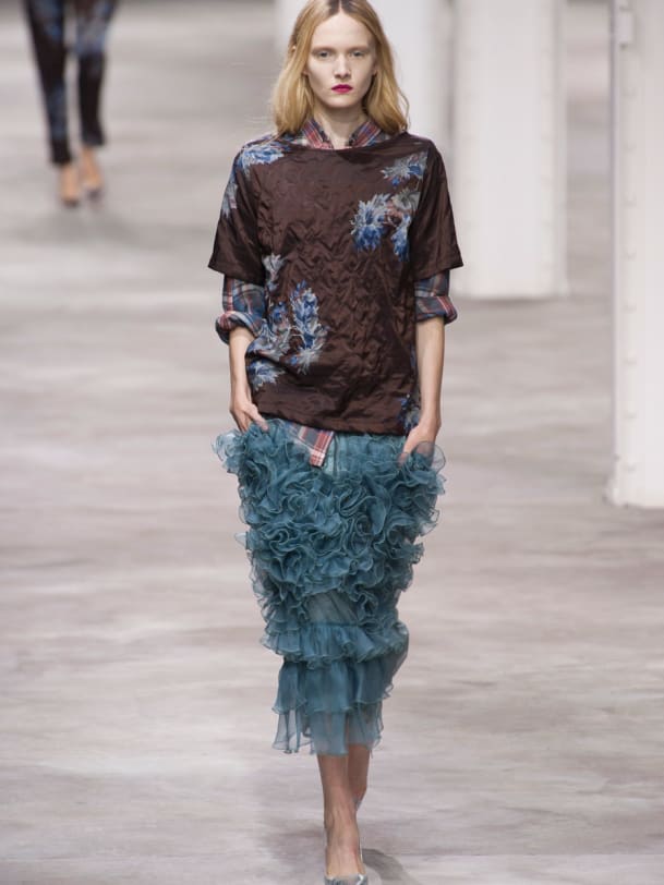 Das Highlight des gestrigen Tages war die Show von Dries Van Noten. Die neue Kollektion: eine gelungene Mischung aus Casual und Couture. Flanellhemden, gemütliche Pullover und Pyjamahosen treffen auf alles, was Couture zu bieten hat: Spitze, Seide, Tüll, Fell und 3D-Applikationen.