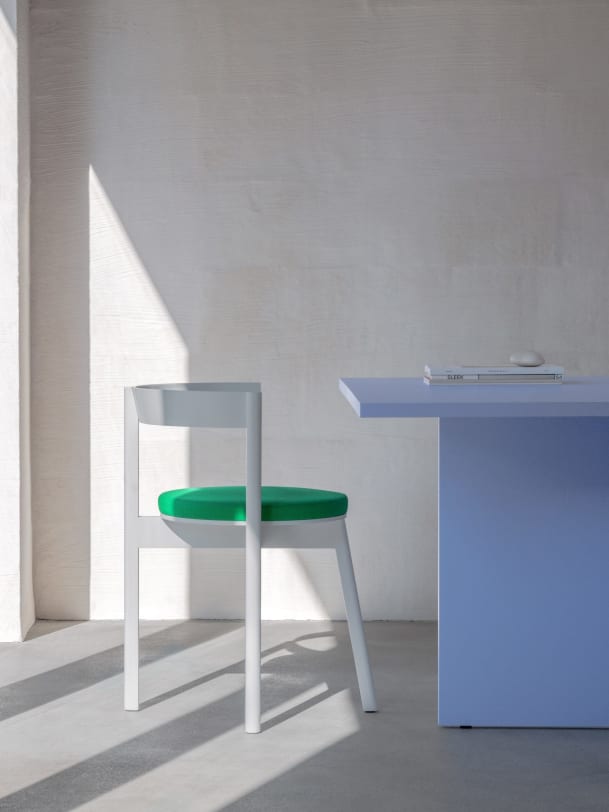 Hä, hat dieser Stuhl etwa schräge Vorderbeine? Ja, hat er. Und eine verlängerte Rückenlehne, die zur Armlehne wird. Es gibt ihn allerdings auch in der schlanken Version ohne Armlehne, aber ebenfalls mit schrägen Vorderbeinen. Irgendwie so lässt sich die etwas verwirrende Konstruktion von Jazz beschreiben. Betörend ist der Sitzgenosse von David und Julian Loehr aus Berlin aber nicht nur deswegen: Er wirkt auch aufgrund seiner Farbgebung.
