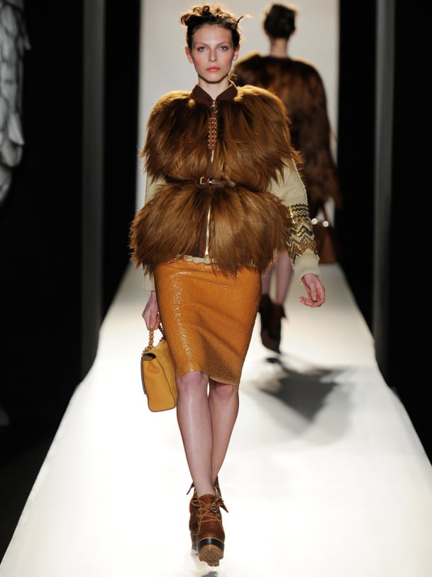 Und als hätte gestern jemand die Stossgebete von all jenen, die sich mit nackten Beinen und nassen Haaren durch Wind und Regen von Show zu Show kämpften, erhört - am Sonntagmorgen herrschte in London strahlendes Frühlingswetter. Die perfekte Kulisse für eine märchenhafte Morgenshow: Mulberry lotste die Gäste durch eine mit riesigen goldenen Ballonen verzierte Eingangshalle im Claridge's Hotel. Drinnen wurde eine Kollektion präsentiert, die von Maurice Sendaks "Where The Wild Things Are" inspiriert war: Zottelige Fellmäntel und -gilets, Jacken mit Hasenfell-umrandeten Kapuzen und Strick. Zu den Looks gabs passende neue Versionen der Alexa-, Maisie- und Lily-Bag.