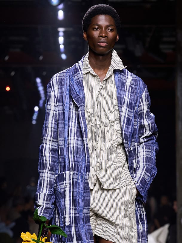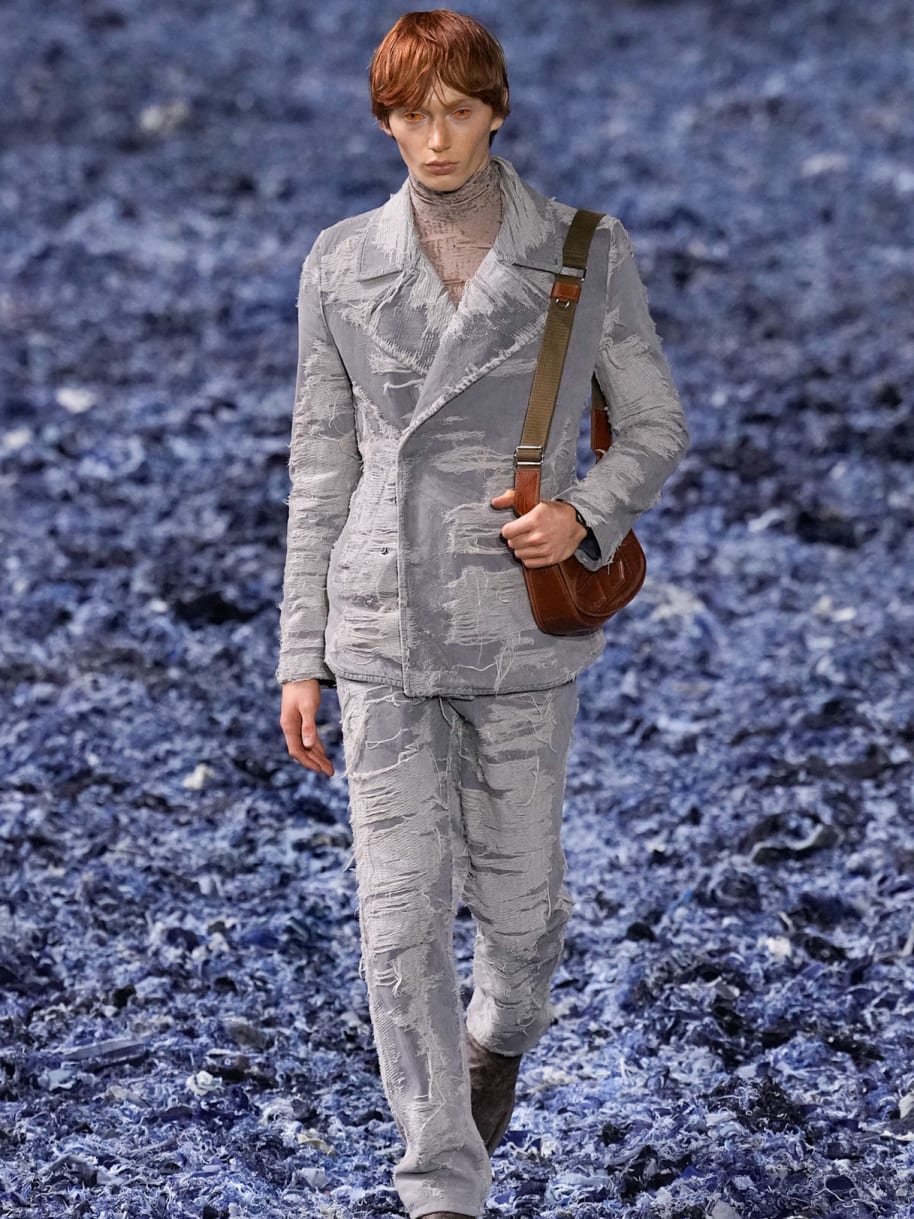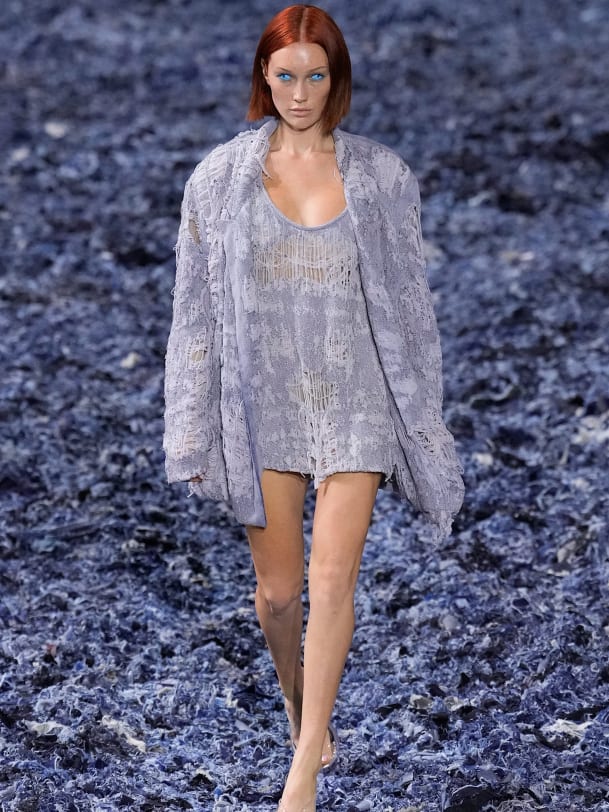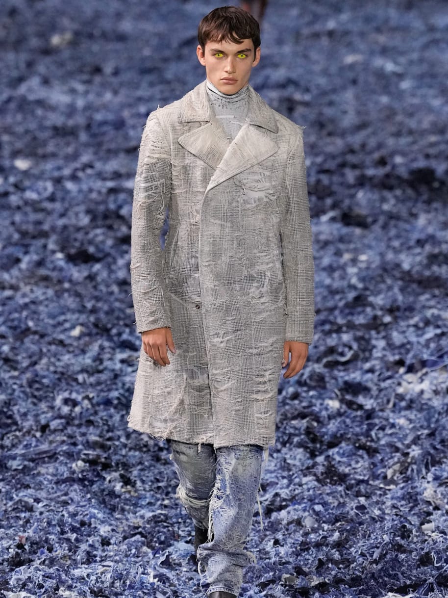 Diesel setzte wie jede Saison auf Model-Influencer:innen wie die Freunde Calum Harper und Kit Price, die durch ein Meer aus 14800 Kilogramm Jeans-Resten stapften (und immerhin nicht stolperten wie einige ihrer Kolleg:innen). Die Stoffschnipsel, die bei der Produktion von Denim anfallen, werden nun zu neuem Garn verarbeitet.
