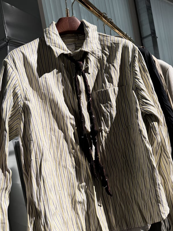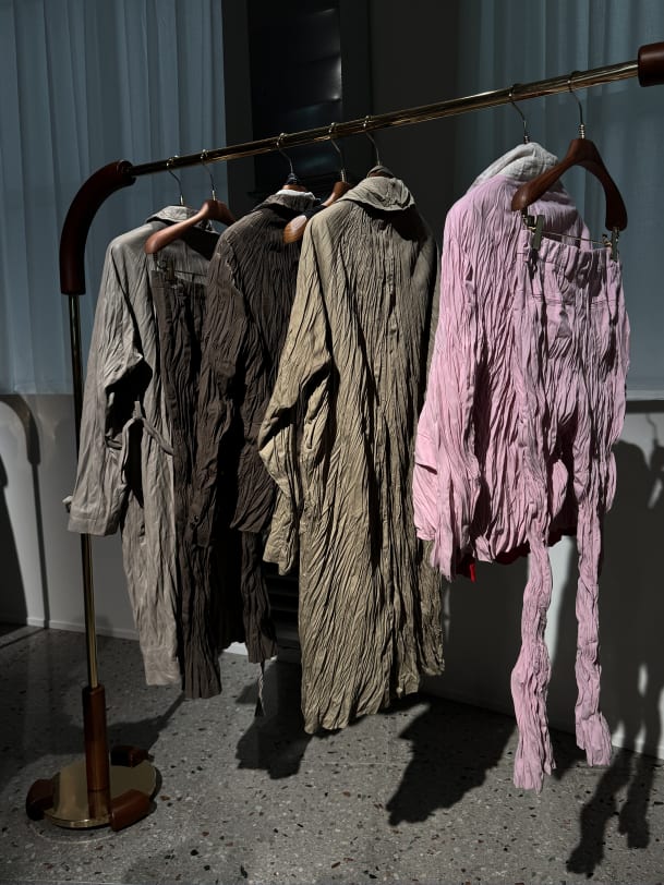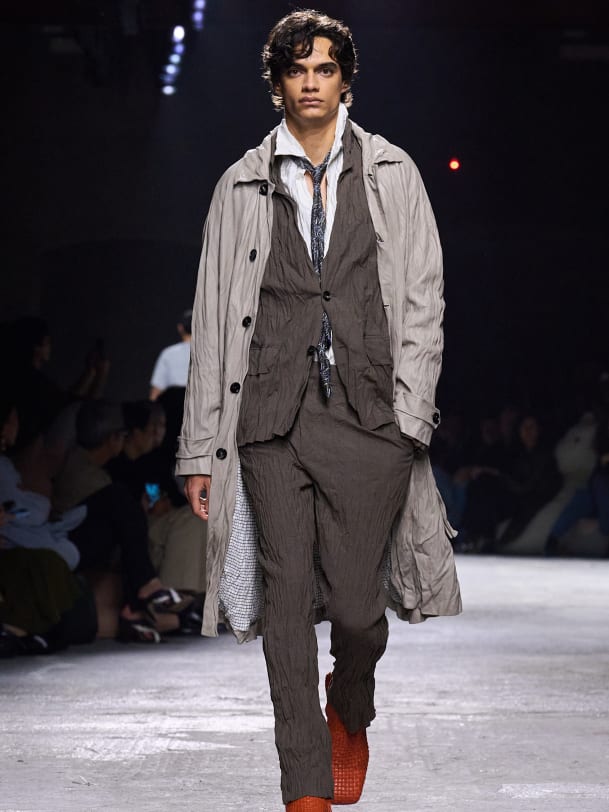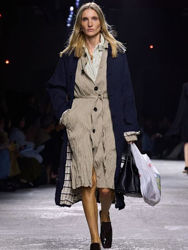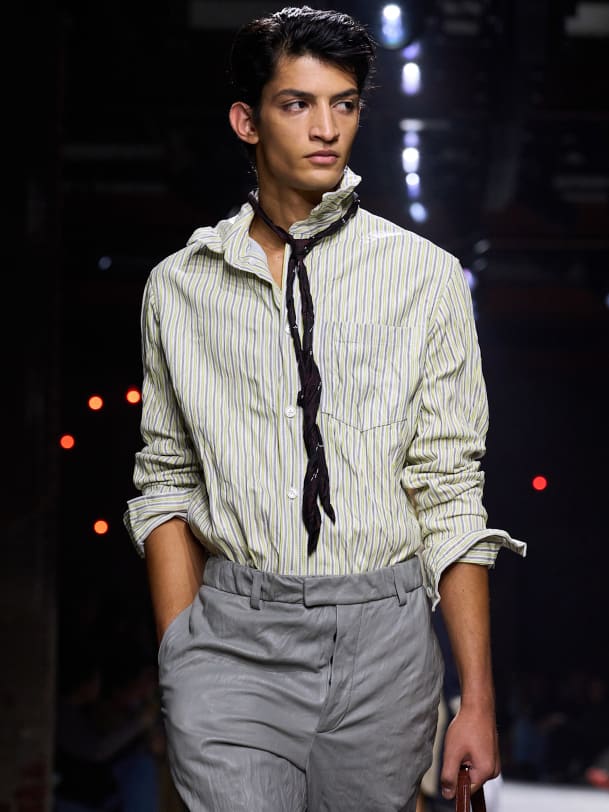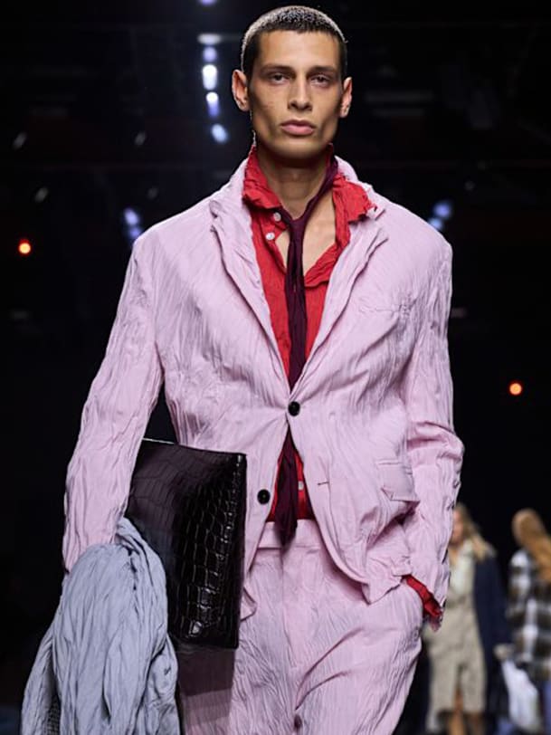 Die Vertreter:innen der Generationen Y und Z haben sich ja erfreulicherweise darauf geeinigt, Alltagskleidung anders als ihre Eltern nicht mehr zu bügeln. Jetzt ziehen die High-Fashion-Häuser auch für delikatere Stücke nach. Bottega Veneta etwa zeigte zerknitterte Hemden und Coats – und eine Krawatte, die aussah, als hätte sie – pardon my french – e chueh ide schnore gha. Auch Ferragamo präsentierte (neben sehr vielen Ballett-Referenzen) zerknautschte Mäntel, die ihre Knitterfalten dank eingewebter Drähtchen auch bei Regen behalten.