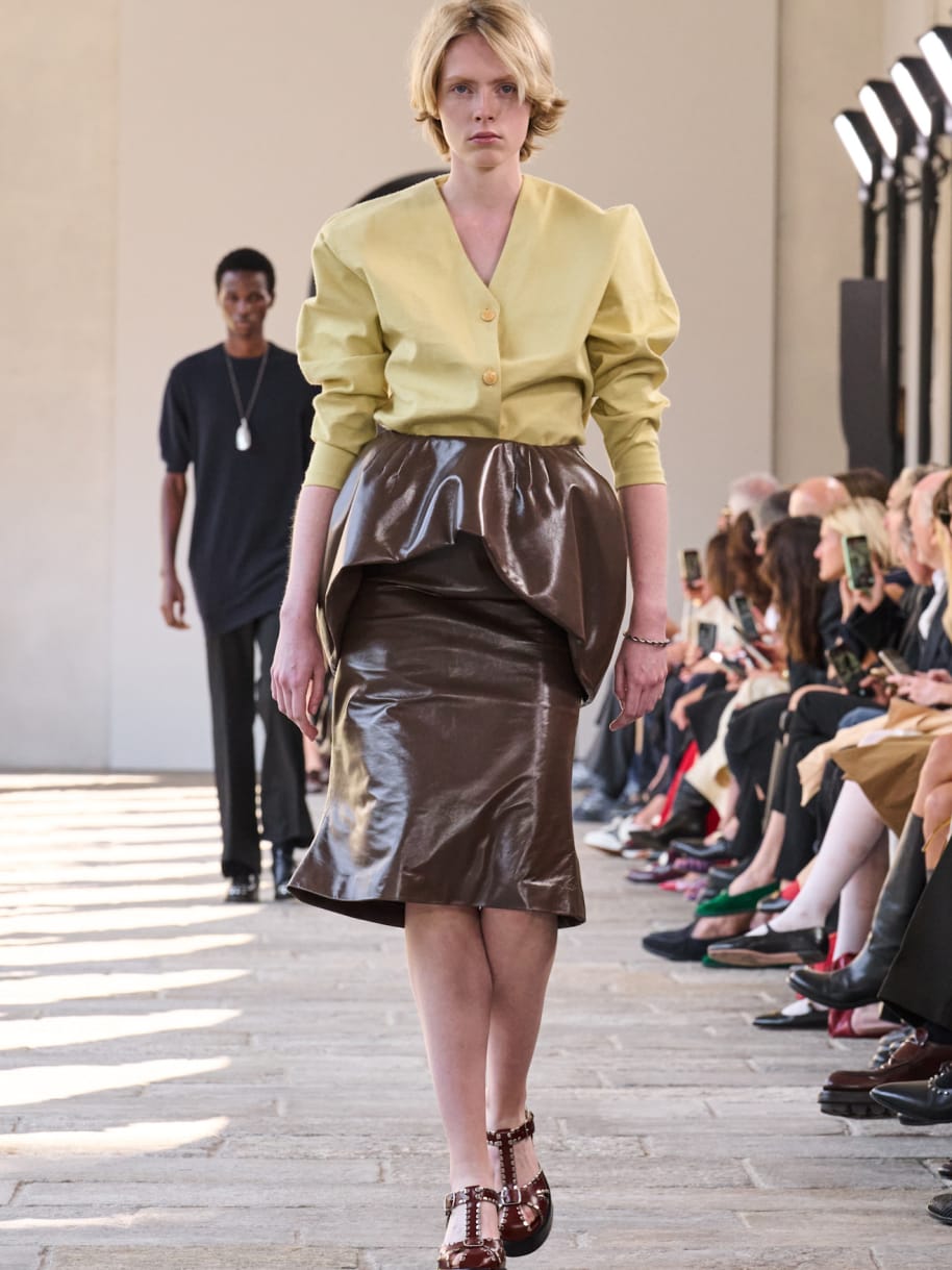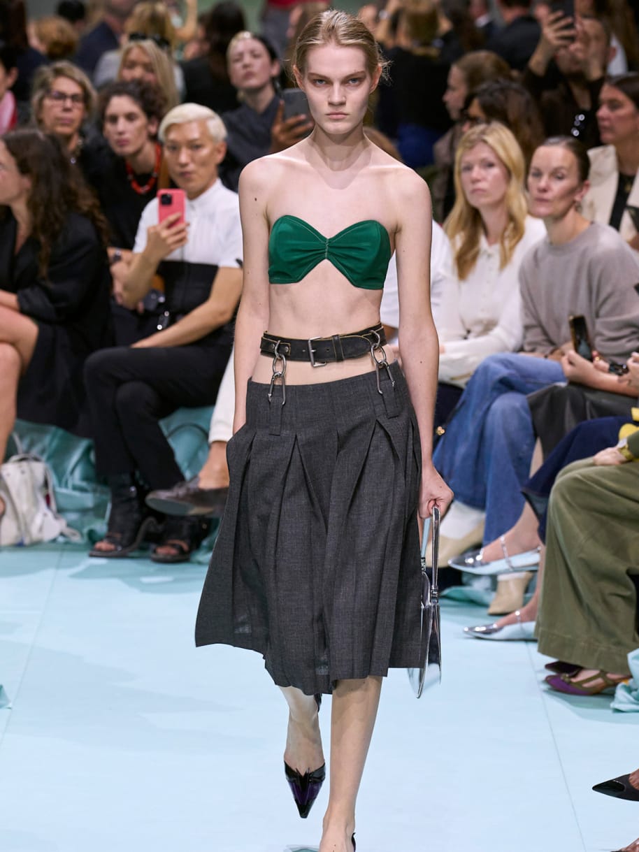 "Sei Gabrielle Chanel von Deauville, aber mit dreckigen Cowboy-Stiefeln", soll Simons gegenüber "Style not Com" gesagt haben. Ausserdem wollte Frau Prada die Taille betonen und tat das zum femininen (und Prada-typischen) Faltenjupe aussergewöhnlicherweise mit einem schweren, abgewetzten Ledergürtel, der mit Karabinern und Metallringen an eben jenem Jupe befestigt wurde und so gleichermassen an einen Werkzeuggürtel erinnerte wie an einen Strapsenhalter. Mal schauen, welche dieser Stücke einzig als Show-Pieces dienten – und welche wirklich für die Läden und die Kundin produziert werden.