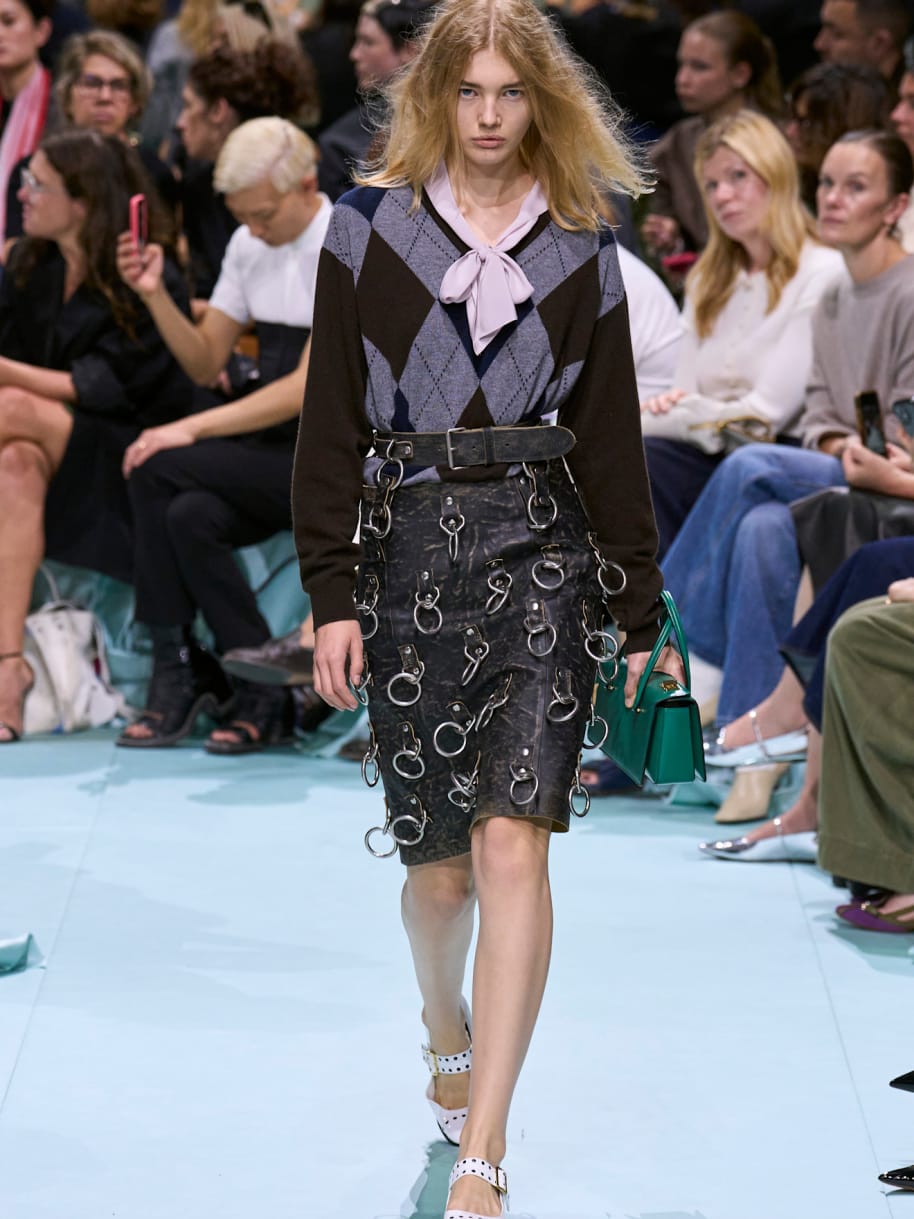 Es war eine ungewöhnliche Kollektion für das Designduo Miuccia Prada und Raf Simons, das Backstage verriet, es hätte etwas Angst gehabt vor der Kollektion, da sie sich wie ein neuer Approach anfühle. Die beiden präsentierten ein Red-Carpet-Federkleid kontrastreich zu einer orangefarbenen Windbreaker-Jacke und eine brave rosafarbene Schluppenbluse mit darübergezogenem Karo-Pulli zu einem 90ies-Grunge-meets-BDSM-Jupe: