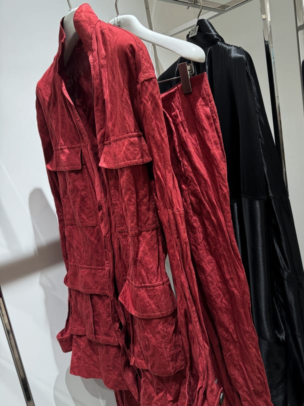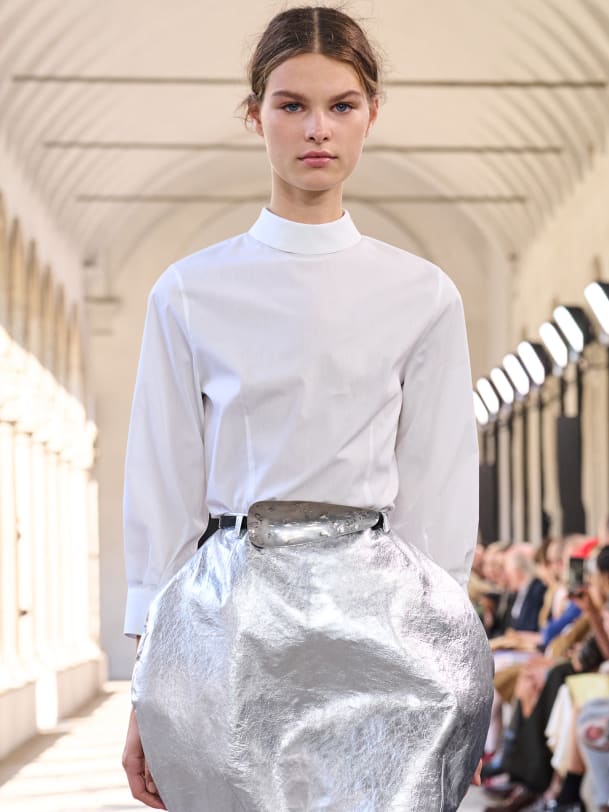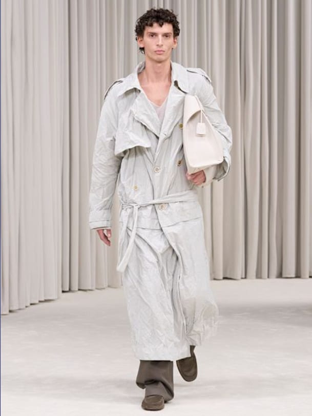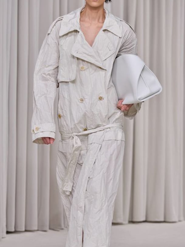 Die Vertreter:innen der Generationen Y und Z haben sich ja erfreulicherweise darauf geeinigt, Alltagskleidung anders als ihre Eltern nicht mehr zu bügeln. Jetzt ziehen die High-Fashion-Häuser auch für delikatere Stücke nach. Bottega Veneta etwa zeigte zerknitterte Hemden und Coats – und eine Krawatte, die aussah, als hätte sie – pardon my french – e chueh ide schnore gha. Auch Ferragamo präsentierte (neben sehr vielen Ballett-Referenzen) zerknautschte Mäntel, die ihre Knitterfalten dank eingewebter Drähtchen auch bei Regen behalten.