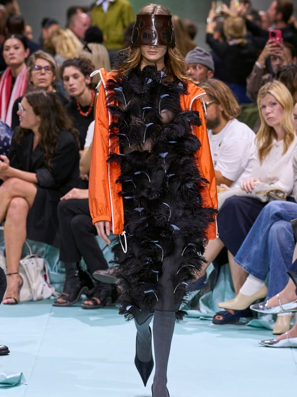 Es war eine ungewöhnliche Kollektion für das Designduo Miuccia Prada und Raf Simons, das Backstage verriet, es hätte etwas Angst gehabt vor der Kollektion, da sie sich wie ein neuer Approach anfühle. Die beiden präsentierten ein Red-Carpet-Federkleid kontrastreich zu einer orangefarbenen Windbreaker-Jacke und eine brave rosafarbene Schluppenbluse mit darübergezogenem Karo-Pulli zu einem 90ies-Grunge-meets-BDSM-Jupe:
