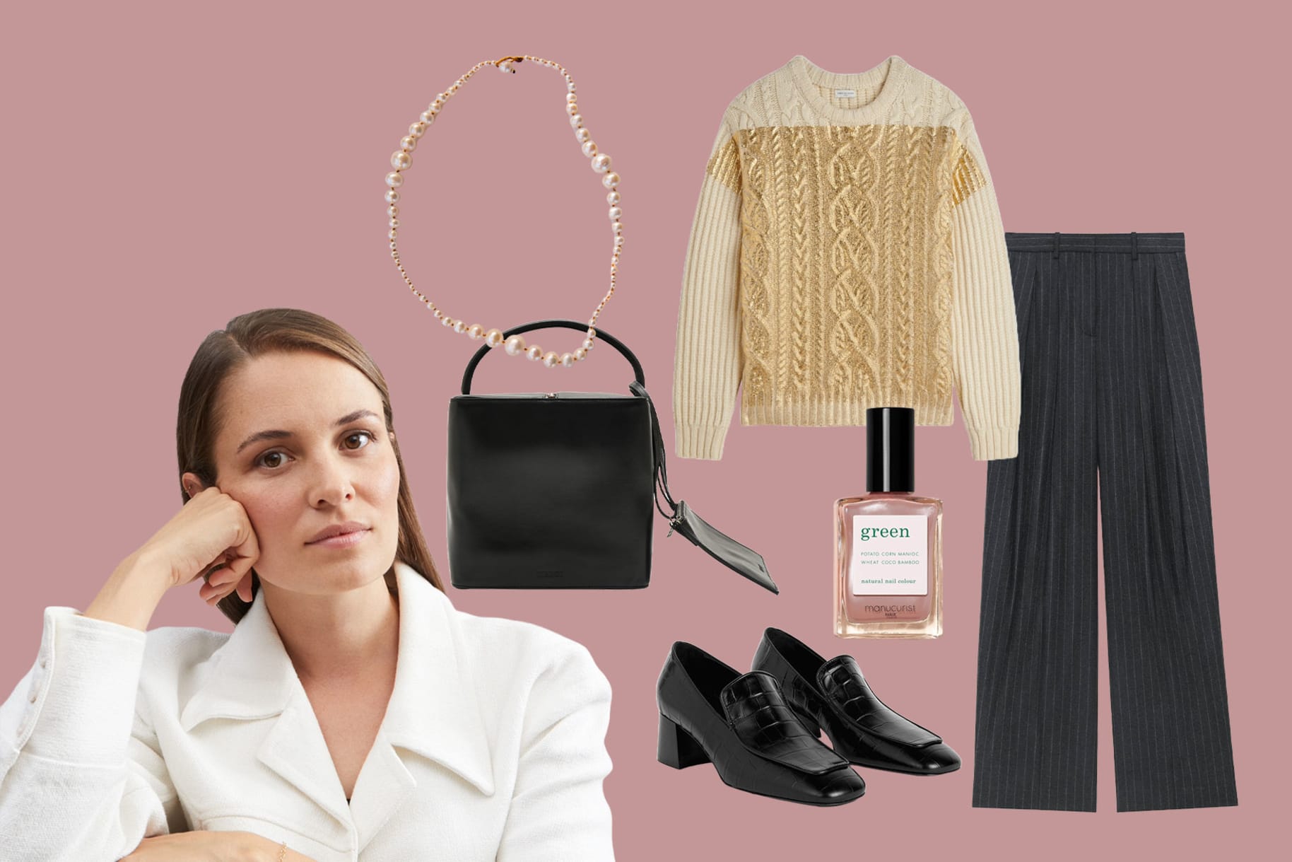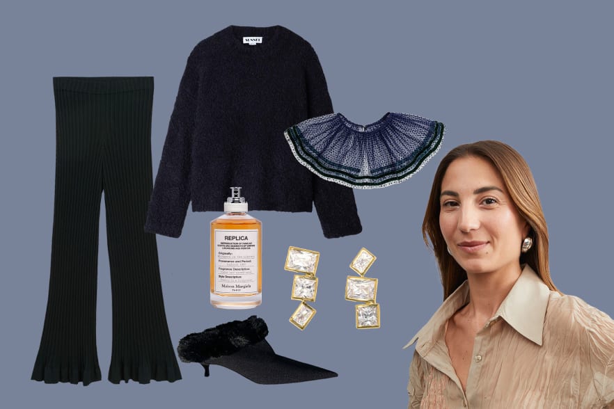 Mein Outfit: Strickhose 340 Fr. von By Malene Birger, Pullover aus Wolle 480 Fr. von Sunnei, Kragen aus Tüll ca. 100 Fr. von La Veste, Eau de toilette Replica "Whispers in the Library", 100ml, ca. 125 Fr. von Maison Margiela, Ohrringe aus recyceltem Silber und 18 Karat Gold Vermeil von Completedworks 185 Fr. bei Opia, Mules mit Kunstpelz vintage von Balenciaga ca. 405 Fr. bei vestiairecollective.com