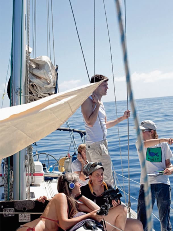 Schwarzblau türmen sich die Wellenberge auf hoher See. Schier unmöglich, etwas zwischen den Wellen zu entdecken. Eine Schwanzflosse? Eine Delfinfinne? Den Blas eines Wals? Nichts dergleichen. "Achtet auf Unregelmässigkeiten im Muster", mahnt Sylvia. Sie hat Feldstecher, GPS und Beobachtungsprotokolle hervorgeholt. Yvonne stellt sich an die Bugspitze, Maria und Michele beziehen rechts und links davon Stellung, die Augen aufs Wasser gerichtet. Sollte ein Wal auftauchen, berechnen wir mit GPS, Kompass und Raster im Feldstecher seine exakte Position. Doch nur der Horizont tanzt in den Gläsern, bis einem schwindlig wird. Skipper Samuel, der Käpten an Bord, dreht die Jacht durch den Wind, das Vorsegel schlägt herum, und die "Johya" nimmt Kurs auf den Hafen. Der erste Tag bot wenig Gelegenheit, Forschergeist zu beweisen. Nur unsere Seetauglichkeit. Apropos: Kann eine solche Jacht eigentlich kentern? "Nein", versichert Samuel, "Gewichte im Kiel halten das Boot im Lot." Dennoch bin ich froh, auf der Hafenmole wieder festen Grund unter den Füssen zu spüren.
