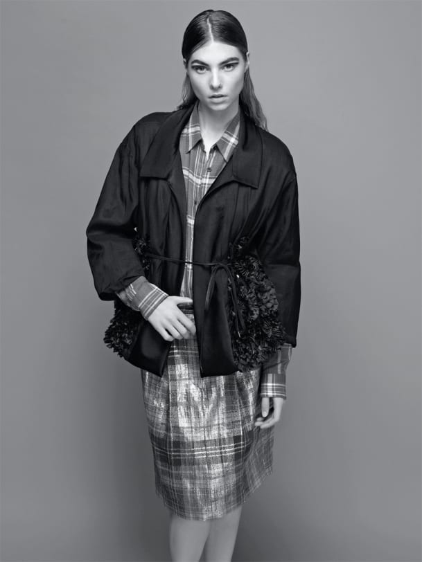 Dries Van Noten: Karohemd, Jupe aus metallbeschichtetem Karostoff, Kimonojacke mit Stoffblüten und Glasperlen bestickt