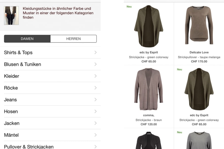 Der Online-Shopping-Anbieter Zalando wollte nicht warten, bis andere Anbieter seinen Shop in ihre Apps einbinden, sondern integrierte im Herbst 2014 die Erkennungsfunktion in die eigene Shopping-App. Die Nutzer sind begeistert und gaben dem Online-Riesen fast die volle Punktzahl. Kein Wunder, die App ist sehr bedienungsfreundlich. Foto knipsen, Foto zuschneiden, gewünschtes Kleidungsstück anwählen und schon poppen auf dem Bildschirm die Zalando-Produkte in jeder Preisklasse hervor.