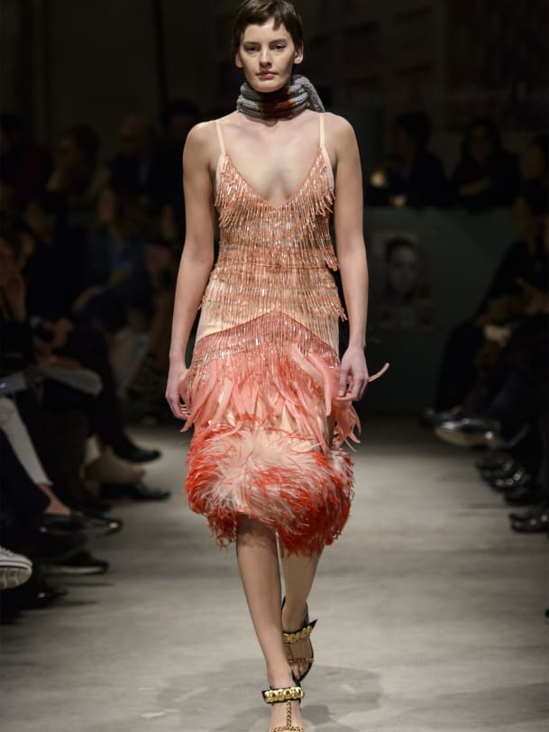 Prada ging bei den Materialien in die Vollen: Shearling, mit Perlen versehene Fransen und besonders viele Federn zierten die Kreationen von Miccuchia Prada. Zudem kamen die Entwürfe in lebhaften Farben wie Lachs, Türkis und Rot daher, was der Kollektion eine eher ungewohnte verspielte Leichtigkeit gab, ohne dass die typische intellektuelle Prada-Frau ihre Haltung verlor.
