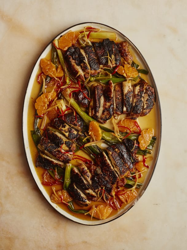 Während die Schenkel garen, für das Caramel-Clementinen-Dressing einen mittelgrossen Topf bei mittlerer bis hoher Temperatur erhitzen. Sobald er heiss ist, mittlere Hitze einstellen und Zucker hinein- streuen – er sollte sofort schmelzen und am Rand bräunen. Nicht rühren, sondern den Topf schwenken, damit der gesamte Zucker schmilzt und tief goldbraun wird; das dauert nur 1 1/2 bis 2 Minuten. Ingwer und Chilis hinzufügen und 45 Sekunden unterrühren, um ihnen etwas Schärfe zu nehmen. Zügig Essig, Limettensaft und Fischsauce unterrühren. Alles 30 Sekunden rühren, dann vom Herd nehmen und 10 Minuten abkühlen lassen.