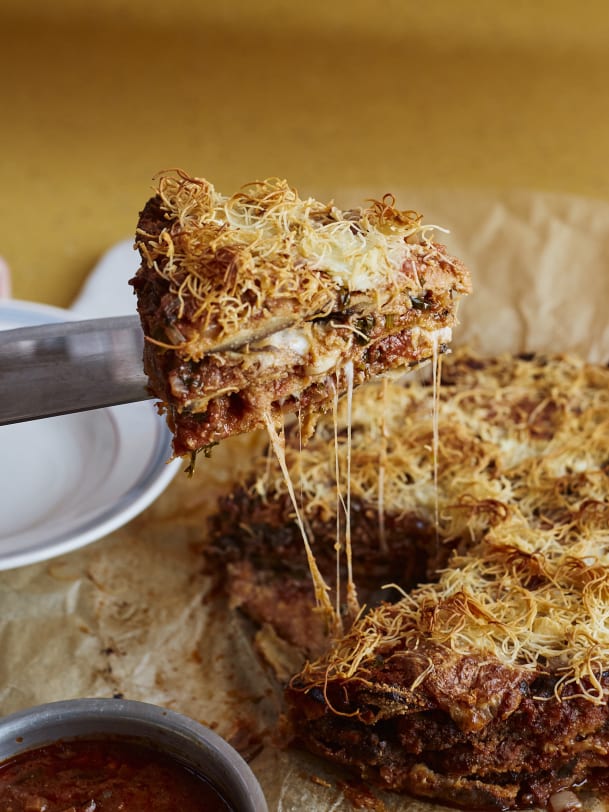 Nun den Pie zusammenbauen: Springform mit Backpapier auskleiden. Ein Drittel der Auberginenscheiben auf den Formboden legen. Jeweils ein Drittel von Sauce, Mozzarella und restlichem Pecorino daraufgeben. Zweimal wiederholen, dann die Kataifi-Mischung gleichmässig darauf verteilen. Pie im Ofen 35 Minuten backen, dann Temperatur auf 200 Grad erhöhen und den Pie weitere 15 bis 20 Minuten backen, bis die Oberseite schön gebräunt ist. Aus dem Ofen nehmen und etwa 30 Minuten ruhen lassen.