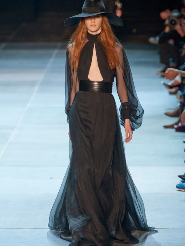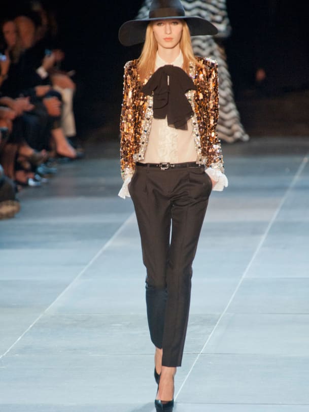 Neuer Designer neuer Name: "Yves Saint Laurent" heisst nur noch "Saint Laurent". Sein Debüt bei Saint Laurent feiert Hedi Slimane mit einer Kollektion im Rock-Gothic-Western-Chic. Viel Schwarz, skinny Jeans, Leder, Spitze, Wildleder, Fransen, oversized Cowboyhüte, Blazer, Anzughosen – Hedi Slimane hat alle Elemente kunstvoll in einem Stil vereinigt.