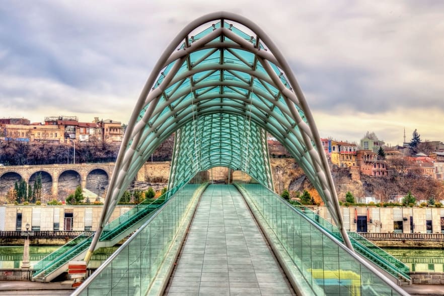 Aus der Kabine des Riesenrads im Mtatsminda-Park schweift der Blick über die Weiten des Kaukasus. Eingebettet zwischen Hügelketten liegt unter uns die Stadt, die den Namen ihren Schwefelbädern verdankt: Das georgische Wort Tbilissi bedeutet warme Quelle.