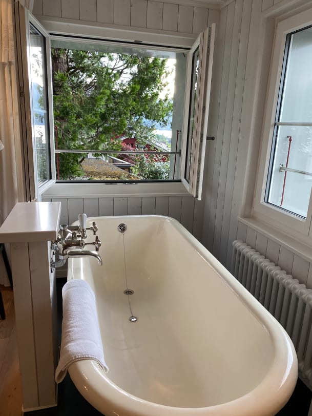 Diesen Vibe hat das Hotel: Die Atmosphäre ist verspielt und heimelig. Die insgesamt zwölf Zimmer sind überraschend ungewöhnlich, alle individuell und mit einem Mix aus stilvoller Romantik, antiken Trouvaillen und modernem Komfort eingerichtet. Fast alle Zimmer haben ein besonderes Highlight gemeinsam: eine freistehende Badewanne, meist mit Blick auf die Bergkulisse und den Vierwaldstättersee. Apropos: Es hat im ganzen Haus auffällig viele Lavabos aus der Belle Époque! Es gibt kein à la carte – in der gemütlichen Gaststube (oder im lauschigen Garten) wird das mehrgängige Menü meist vom Chef persönlich vorgestellt. "Lädele" kann man ausserdem im eigenen Spezialitätenladen oder im Schlüssel-Brocki. Win, win, win.