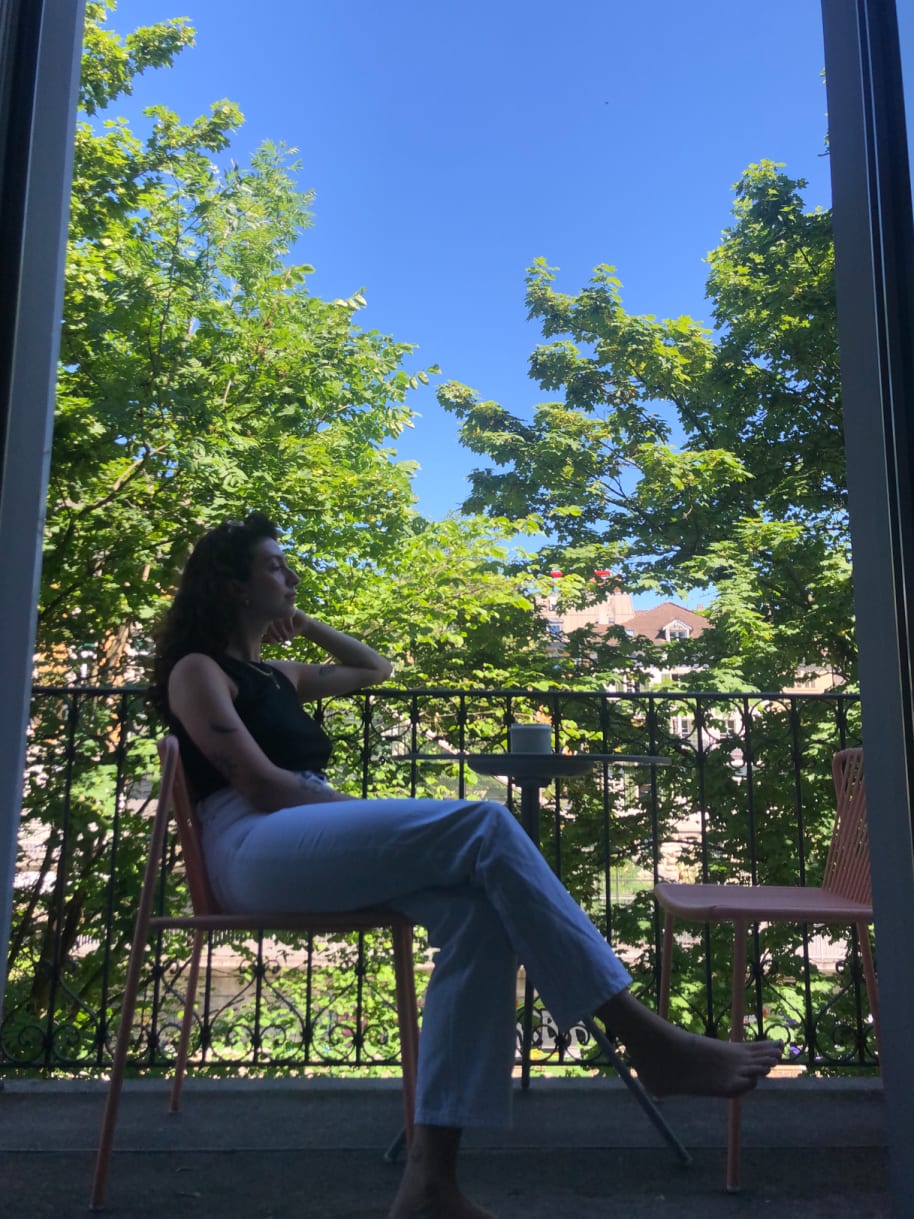 Mein Lieblingsort im Hotel: Die Bibliothek bietet eine kuratierte Auswahl von Designbüchern an, mit denen man sich mit einem Kaffee oder Tee auf den Balkon setzen kann. Von dort aus hat man eine schöne Aussicht auf die plätschernde Sihl.