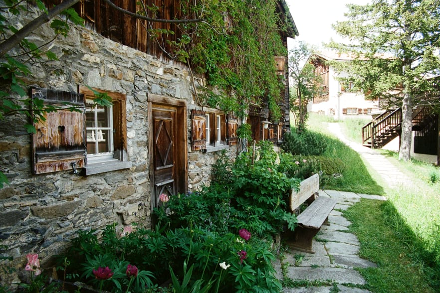 Instagrammable: 10/10. Alles hier ist fotogen – neben dem Panorama vor allem die jahrhundertealten Maiensässe aus Granit und sonnenverbranntem Holz und die Wildblumenwiesen davor.