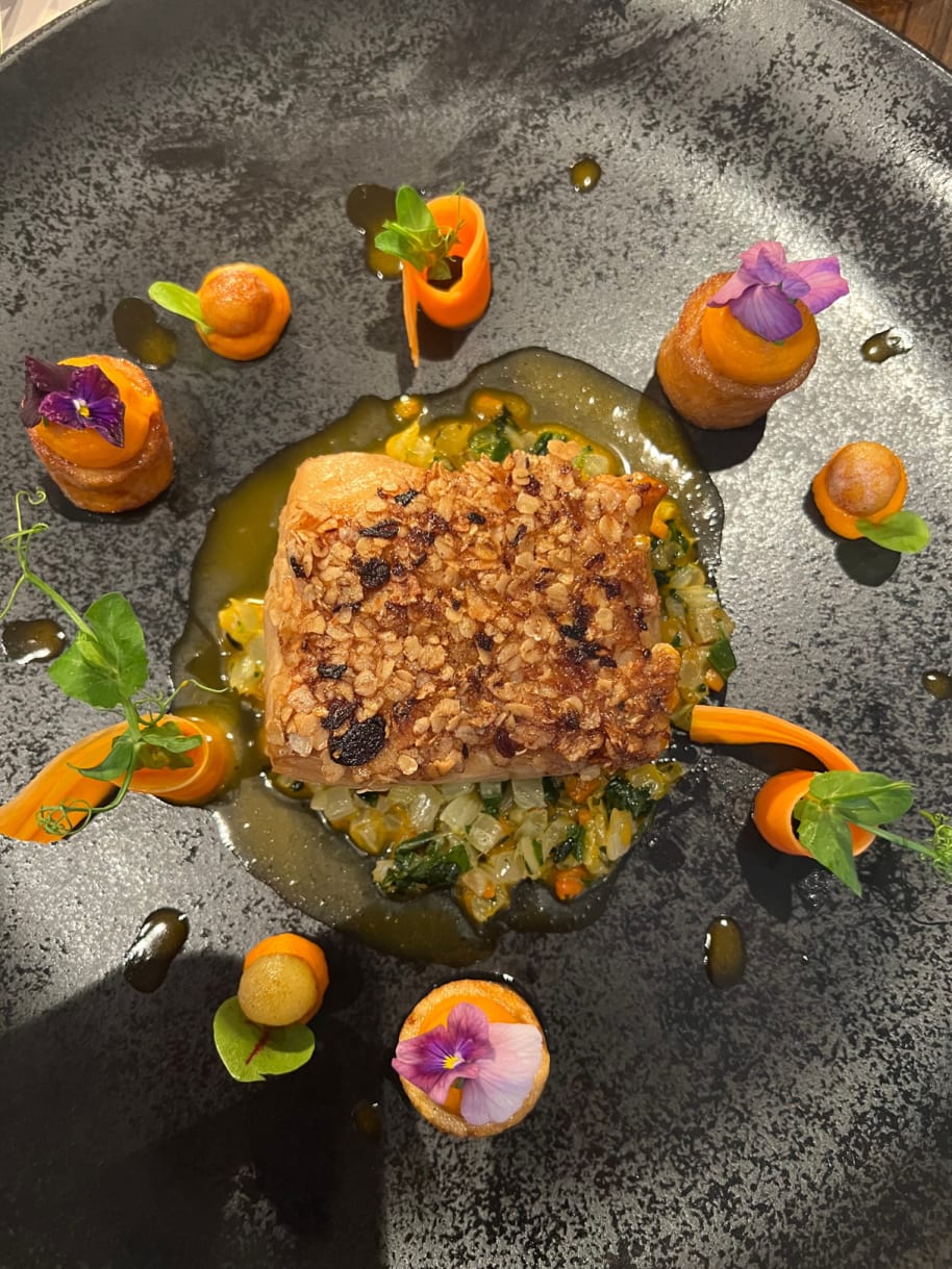 Unbedingt essen: im Outdoor-Restaurant Fö, das eben erst eröffnet hat. Fö bedeutet Feuer auf Rätoromanisch: Bei schönem Wetter wird in der Glut und über lodernden Wacholderzweigen ein Mehrgangmenü gezaubert, das die Gäste draussen verspeisen. Mir schmeckten besonders die "Sellerieknollen in der Glut mit Tannenzweigen gegart" und die "Kartoffeln aus dem Erdloch mit Moos". Für Carnivor:innen empfehlen sich Lachsforelle und Schweinebauch.