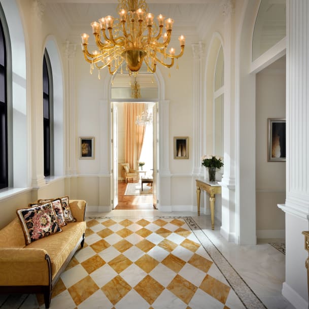 Entlang des Dubai-Kanals ragt ein pompöser Palast mitten in der Wüste empor – der Bau der Versace-Familie ist ein Stück neoklassizistisches Italien. Und wie die Marke selbst, so steht auch das zweite Hotel des italienischen Fashionbrands ganz im Sinne der Opulenz. Im Innern weisser Marmor, aufwendige Mosaike, prächtige Säulen, goldene Verzierungen und pompöse Versace-Symbolik. Hier verschmilzt griechische Mythologie, etwa die Sage von Atlantis, mit Geschichten aus 1001 Nacht. Tagsüber findet man in den Bassins der grossen grünen Pool-Oase Abkühlung oder schwitzt entspannt unter künstlichem Sternenhimmel im marokkanischen Hamam. Nachts träumt man – in massgeschneiderte lachs- und ozeanfarbene Bettlaken gehüllt und auf ebensolchen Kissen gebettet – nicht nur von, sondern eben auch in Versace.