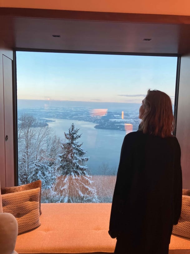 Mein Lieblingsort im Hotel: Die gemütliche Sitzbank in unserer Fensterfront, auf der man – auf Augenhöhe mit den Alpen – über Wald und Vierwaldstättersee schwebt. Lesen? Keine Chance! Das Panorama ist viel zu atemberaubend. Im Idealfall lodert noch das Feuer im zimmereigenen Gas-Kamin.